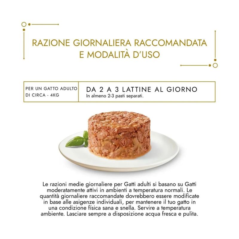 N.B. Il prodotto è disponibile in formato lattina multipack da 48x85G nel gusto Mix Carne e Pesce e contiene 12 lattine al gusto Pollo, 12 lattine al gusto Manzo, 12 lattine al gusto Tonno, 12 lattine al gusto Salmone ed anche nella versione kit risparmio 96x85G con 24 lattine per ogni gusto sopraindicato.
