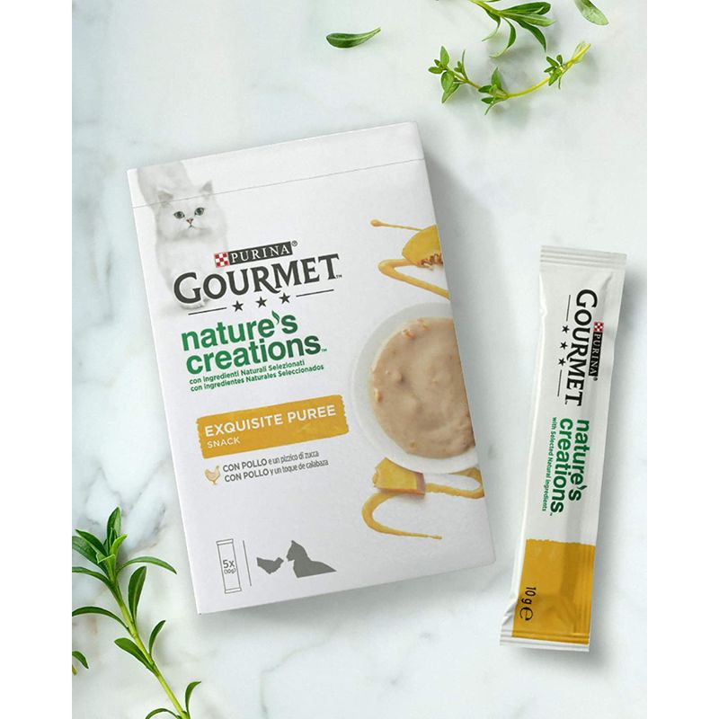 Purina Gourmet Nature's Creations Exquisite Puree gourmetTM nature's creations soup offre una gamma di gustose ricette per un’esperienza sensoriale unica che il tuo gatto adorerà. Riconoscerai a prima vista i raffinati ingredienti naturali, come pezzetti di pollo o pesce. gourmetTM nature's creations soup è una deliziosa esperienza culinaria, il tuo gatto farà fusa di piacere. Le ricette sono senza coloranti, conservanti e aromi artificiali aggiunti.