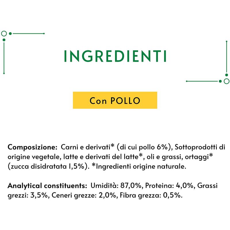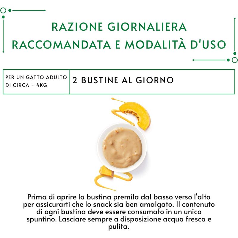 N.B. Il prodotto è disponibile nella confezione da 5 pratiche bustine da 10G ciascuna, gusto Pollo.