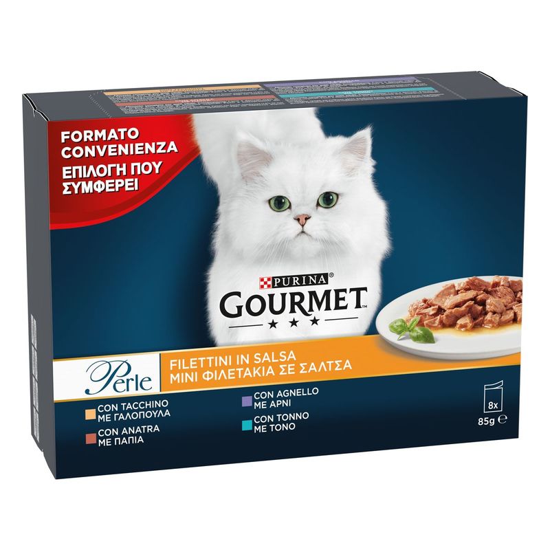 Scegli Gourmet Perle Filettini in Salsa Cat Busta Multipack 8x85G regalare al tuo amico felino un'esperienza culinaria degna dei palati più esigenti, dove ogni pasto diventerà un momento di piacere e soddisfazione per il tuo amato gatto.