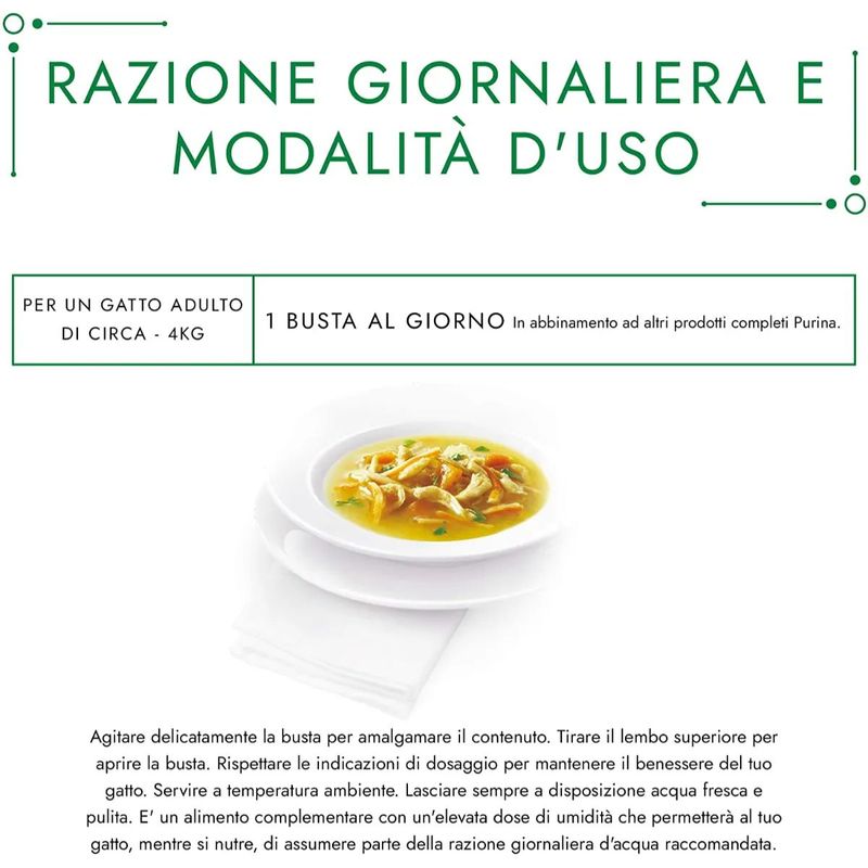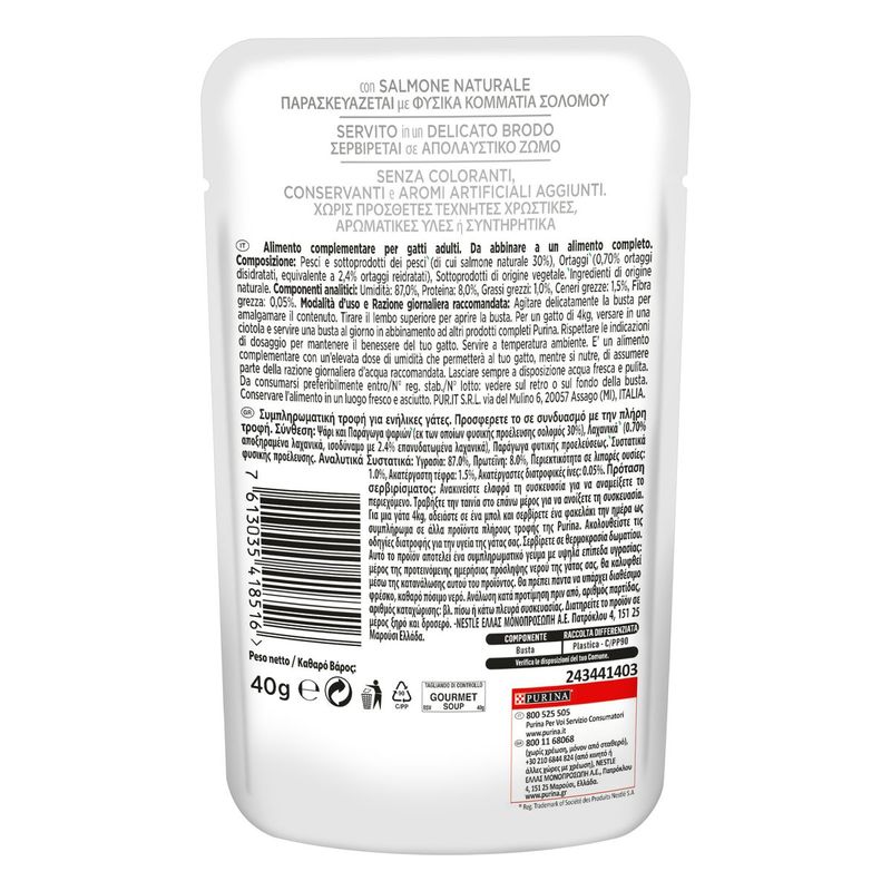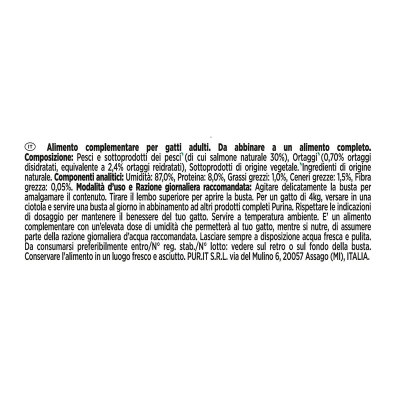 N.B. Il prodotto è disponibile in formato busta multipack da 32x40G nei gusti a scelta tra: Pollo con Surimi e Verdure, Pollo e Verdure, Pollo Naturale, Salmone e Verdure, Tonno e Acciughe, Tonno e Gamberetti, Tonno e Verdure.