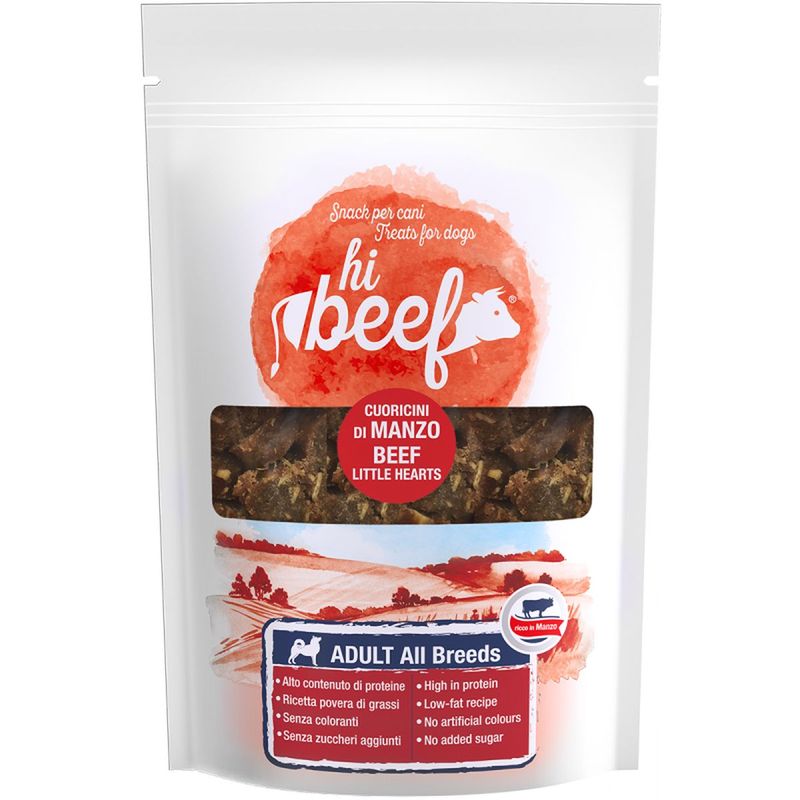Stai cercando una coccola per il tuo amico peloso? Delizialo con un fuori pasto sano e delizioso della linea Hi Beef, snack a forma di cuoricini al gusto manzo. Che bontà!