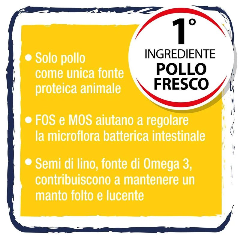• Contiene carne fresca d'pollo come fonte principale di proteina animale.