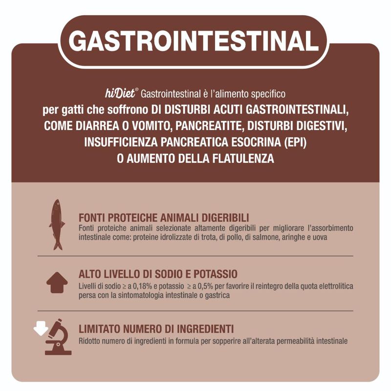 Se il tuo gatto adulto sta affrontando problemi gastrointestinali, comprendiamo quanto sia cruciale fornirgli un'adeguata nutrizione per gestire questa condizione specifica. Hi Diet Gastrointestinal è una linea di alimenti appositamente progettata dai veterinari per soddisfare le esigenze nutrizionali particolari associate a disturbi gastrointestinali e fornisce ingredienti facilmente digeribili, fibre selezionate e nutrienti essenziali che favoriscono la salute intestinale e contribuiscono al benessere generale del tuo gatto. Investi nella salute gastrointestinale del tuo amico felino, offrendogli una dieta mirata e bilanciata con Hi Diet Gastrointestinal.
