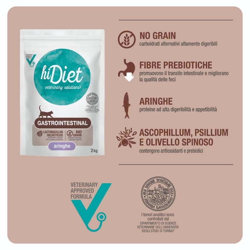Hi Diet Cat Gastrointestinal è un alimento dietetico secco per gatti adulti, che soffrono di disturbi acuti gastrointestinali. Questo prodotto è stato appositamente formulato per fornire un supporto nutrizionale ottimale a felini che possono soffrire di disturbi gastrointestinali come diarrea, vomito, pancreatite, disturbi digestivi, insufficienza pancreatica esocrina (epi), o aumento della flatulenza. Questo mangime senza glutine contiene l’aringa come ingrediente di alta qualità, che non solo conferisce un sapore delizioso, ma rappresenta anche una fonte proteica alternativa, riducendo al minimo il rischio di potenziali allergeni. La formula è arricchita con lactobacillus helvetivus, un probiotico che supporta il microbiota intestinale, promuovendo una digestione sana e l'equilibrio dell'ambiente intestinale. Invece, per garantire un transito gastrointestinale ottimale e migliorare la qualità delle feci, questo prodotto contiene fibre proteiche di alta qualità, che aiutano a mantenere il sistema digestivo efficiente e favoriscono una migliore assorbimento dei nutrienti. Inoltre, per proteggere il tuo felino dagli effetti dannosi dello stress ossidativo, questo mangime contiene anche antiossidanti naturali che aiutano a neutralizzare i radicali liberi, riducendo il rischio di danni cellulari e mantenendo il tuo amico peloso in salute e vitale.