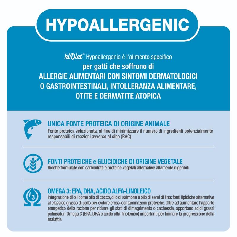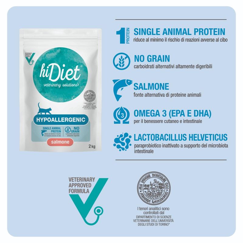 Hi Diet Cat Hypoallergenic è un alimento dietetico secco per gatti adulti, che affrontano allergie alimentari con manifestazioni dermatologiche o gastrointestinali, intolleranze alimentari, otiti dermiche e dermatiti atopiche. Questo prodotto senza glutine contiene il salmone selezionato con attenzione come unica fonte proteica di origine animale e primo ingrediente nella composizione, che non solo offre un gusto irresistibile, ma rappresenta anche una scelta ideale per ridurre il rischio di reazioni avverse al cibo, grazie alla sua alta digeribilità e appetibilità. Questo mangime è arricchito con omega-3, EPA, DHA e acido alfa-linoleico, nutrienti essenziali che non solo contribuiscono a limitare la progressione di eventuali malattie, ma anche a mantenere un sano stato infiammatorio nel corpo del tuo felino. Questi ingredienti aiutano a supportare la salute cardiovascolare, articolare e cutanea del tuo amico peloso, garantendo che rimanga attivo e vitale per lungo tempo. La formula è arricchita con lactobacillus helvetivus, un probiotico che supporta il microbiota intestinale, promuovendo una digestione sana e l'equilibrio dell'ambiente intestinale. Inoltre, può essere impiegato con successo in situazioni di diarrea o infezioni intestinali frequenti, fornendo una soluzione nutrizionale che mira a stabilizzare e promuovere il benessere del tuo gatto.