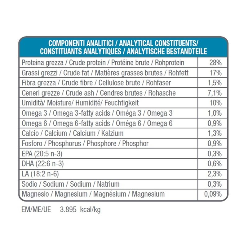 • Contiene il salmone come fonte di proteina animale.