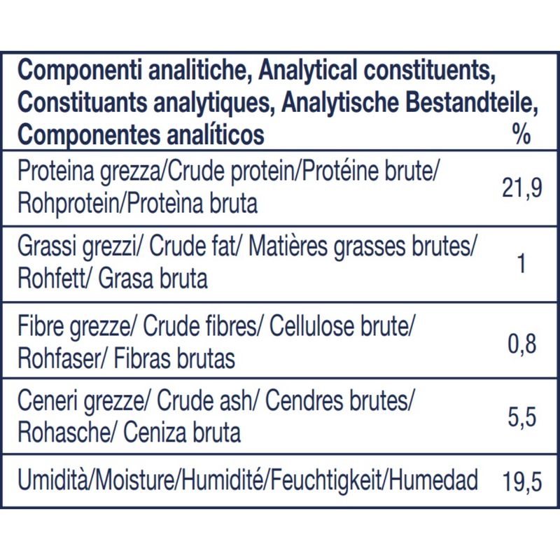 • Senza soia, frumento, uova, latticini e farine di carne.