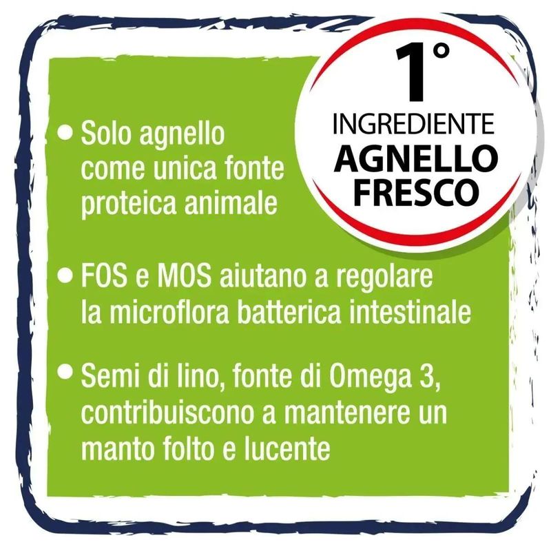• Contiene l’agnello come fonte di proteina animale.