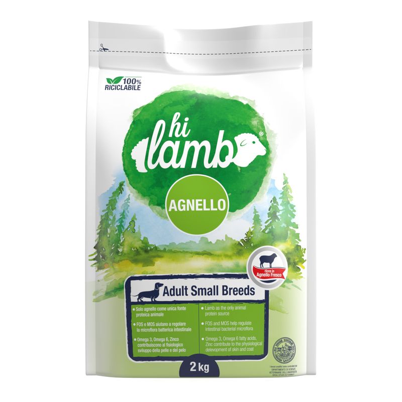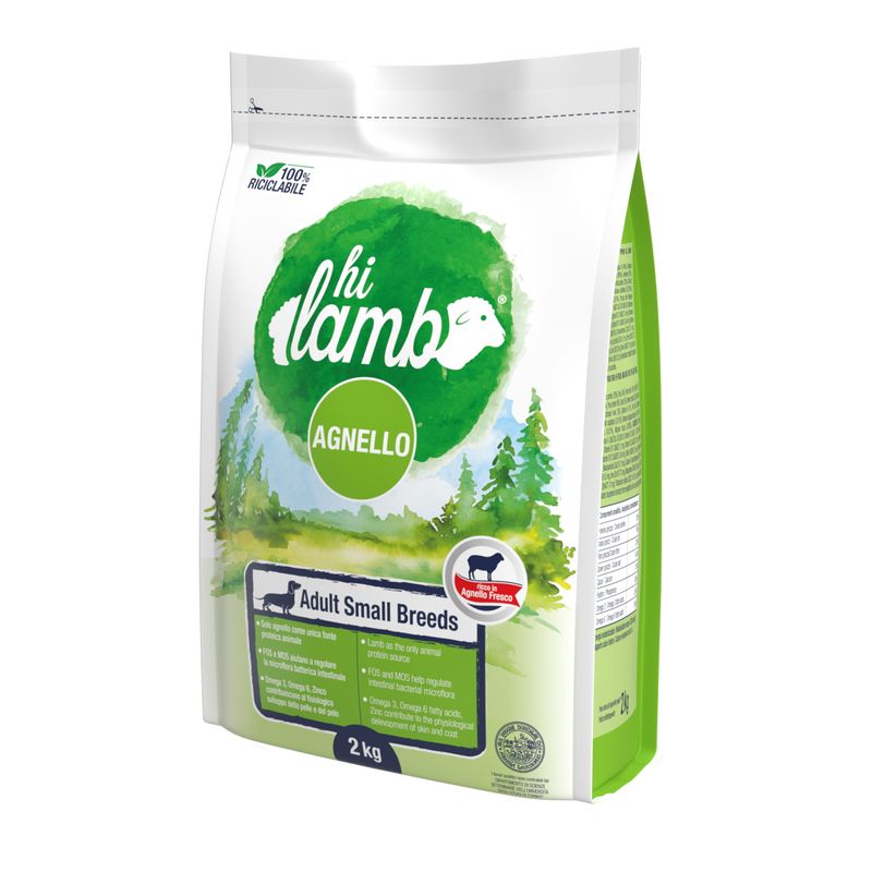 Hi Lamb Dog Adult Small Breeds Agnello è un alimento secco completo e bilanciato, appositamente formulato per soddisfare appieno le esigenze nutrizionali dei cani adulti di taglia piccola. Frutto di una ricerca attenta e di una produzione italiana di qualità, questo alimento rappresenta un concentrato di gusto e salute. Questo alimento contiene l’agnello fresco che conferisce al prodotto un sapore irresistibile, oltre a fornire una fonte di proteine di alta qualità che contribuiscono al mantenimento della salute muscolare del tuo cane. Grazie alla presenza di una sola fonte proteica di origine animale, questo alimento è particolarmente indicato per cani con sensibilità alimentari o allergie. Questa prelibatezza utilizza il riso, un cereale nobile noto per la sua digeribilità, come fonte di carboidrati essenziali per sostenere l'energia e la vitalità del tuo fedele amico a quattro zampe. Per garantire un ambiente domestico più piacevole, questo alimento contiene anche Yucca schidigera, un ingrediente naturale che contribuisce attivamente a ridurre il cattivo odore delle feci e delle urine del tuo amico fedele, mantenendo fresca e pulita la tua casa. Inoltre, Hi Lamb Dog Adult Small Breeds Agnello è arricchito con M.O.S, che favoriscono una regolare attività intestinale migliorando la salute del colon, e con inulina di cicoria, fonte di F.O.S, che contribuisce all'equilibrio della microflora batterica intestinale. Mentre, l'aggiunta di omega-3, omega-6 e zinco contribuisce al mantenimento di una pelle sana e di un pelo lucente, per un aspetto esterno radioso del tuo fedele amico.