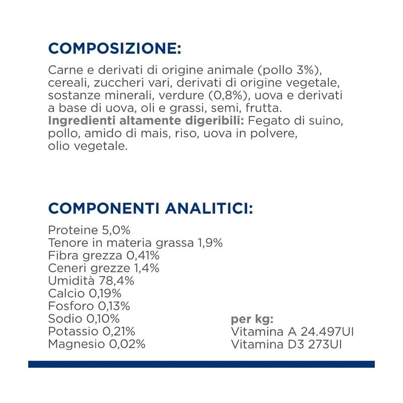 N.B. Il prodotto è disponibile al gusto pollo e verdure aggiunte in formato da 156G, kit risparmio 24x156G.