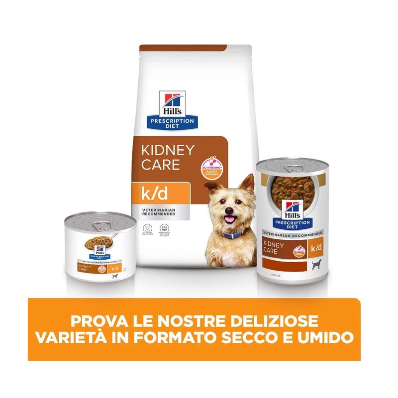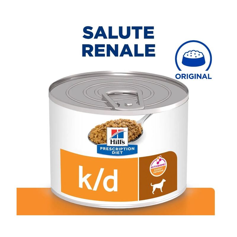 Hill’s Prescription Diet Dog Kidney Care k/d Original è un alimento umido dietetico completo, specificamente formulato per stimolare la funzione renale in casi di insufficienza renale acuta o cronica e per contribuire a ridurre l'occorrenza di episodi di uremia. Questo alimento è preparato con una speciale ricetta che contiene una bassa dose di fosforo e un tenore ristretto di proteine ma di elevata qualità. Inoltre, l'alto contenuto di antiossidanti aiuta a contribuire all'eliminazione dei radicali liberi. Hill's Prescription Diet k/d Kidney Care può essere facilmente somministrato in combinazione con un alimento secco di Hill's, permettendo al tuo cane di godere di una dieta gustosa e variata, che soddisfa le sue esigenze nutrizionali e supporta la sua salute renale. Realizzato con la tecnologia esclusiva di Hill's ActivBiome+, una speciale miscela di fibre prebiotiche, questo alimento è clinicamente testato per nutrire rapidamente il microbioma intestinale, supportando la qualità ottimale delle feci e la salute complessiva dell'apparato digerente. Grazie a questa tecnologia avanzata, l'alimento promuove un equilibrio ottimale della flora intestinale, garantendo una digestione efficiente e un assorbimento ottimale dei nutrienti.