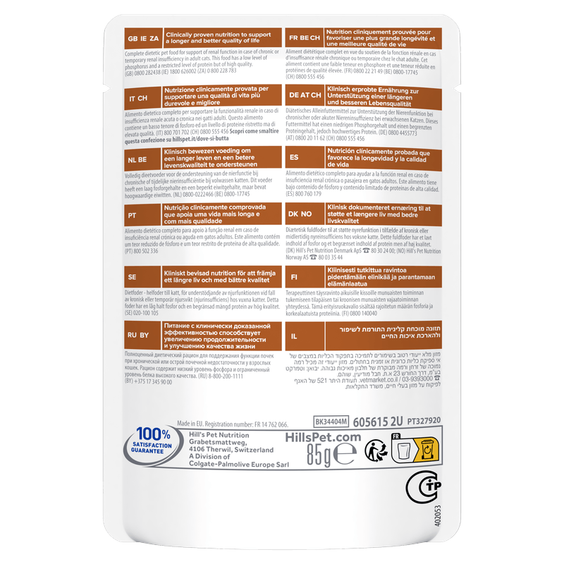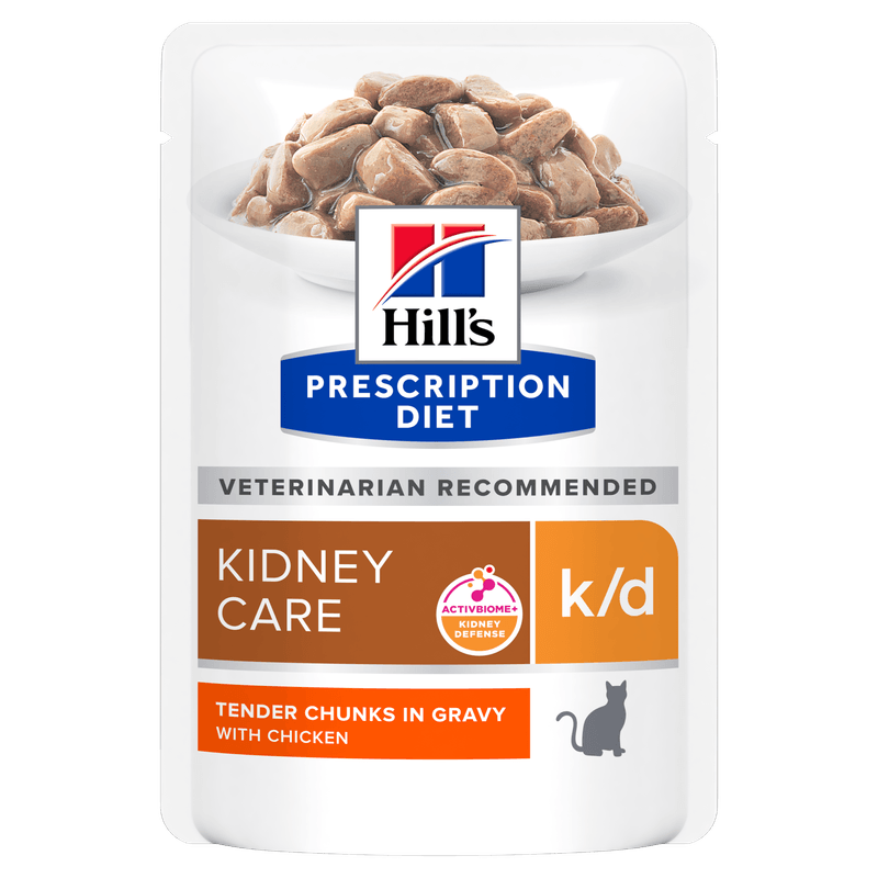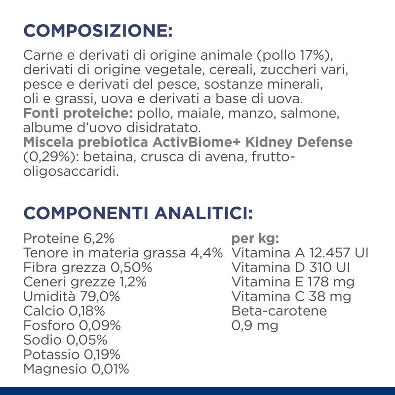 La tecnologia ActivBiome+ lavora attivamente per mantenere la salute del tratto digerente e del microbioma intestinale, mentre la bassa quantità di fosforo e sodio, insieme agli omega-3 provenienti dall'olio di pesce, contribuiscono a sostenere la funzione renale vitale. Hill's Prescription Diet k/d con pollo è un alimento completo ed equilibrato che fornisce tutte le nutrizioni essenziali per il tuo gatto. Per ottenere i migliori risultati, è fondamentale fornire una dieta costante e a lungo termine di questo prodotto. Le formule secche, in lattina e in bustina possono essere miscelate o somministrate contemporaneamente per garantire una varietà nella dieta del tuo gatto.