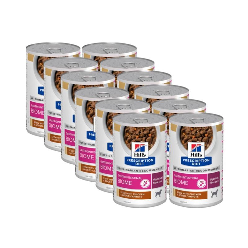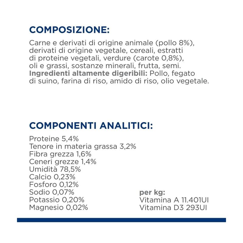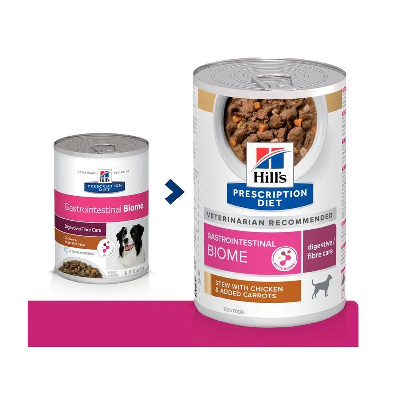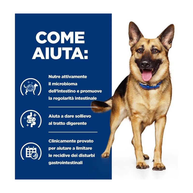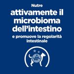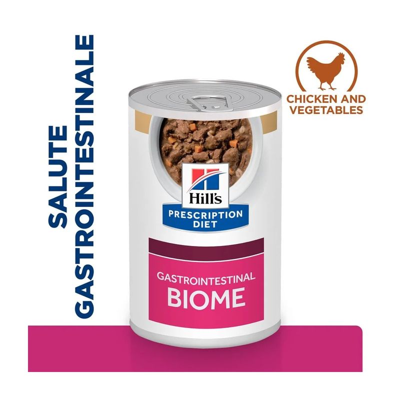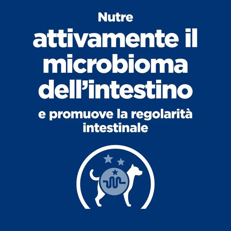 Hill's Prescription Diet Gastrointestinal Biome Alimento Umido per Cani è un alimento umido dietetico completo, specificamente formulato per supportare la funzionalità intestinale nei cani adulti. L’innovativa tecnologia di ingredienti contenuti in Hill's Prescription Diet Cane Gastrointestinal Biome è in grado di aiutare, in breve tempo, i cani con disturbi gastrointestinali fibro-responsivi. Anni di ricerca sul microbioma intestinale, composto da miliardi di microrganismi con un equilibrio dinamico tra quelli desiderabili e indesiderabili unico per ogni soggetto, hanno permesso a Hill's di introdurre una miscela esclusiva di fibre in grado di nutrire questo microbioma. La formulazione di questo alimento contiene il pollo come fonte di proteina animale di alta qualità e verdure aggiunte, garantendo un apporto proteico ottimale per il tuo cane. Contiene una miscela di fibre capace di rilasciare e attivare antiossidanti e polifenoli antinfiammatori, supportando così la salute generale e il benessere dell'animale. Grazie a queste proprietà, questo alimento è indicato per cani con enteropatie fibra-responsivi, diarrea antibiotico responsiva, costipazione e diarrea. Questo cibo umido per cani promuove rapidamente una sana consistenza e regolarità delle feci, riducendo il rischio di episodi futuri. Inoltre, un elemento distintivo di questo alimento è la rivoluzionaria tecnologia ActivBiome+, che nutre il microbioma del tuo animale domestico. Questa tecnologia avanzata contribuisce a migliorare la salute intestinale del cane, favorendo la crescita di batteri benefici nell'intestino e migliorando così la qualità delle feci.