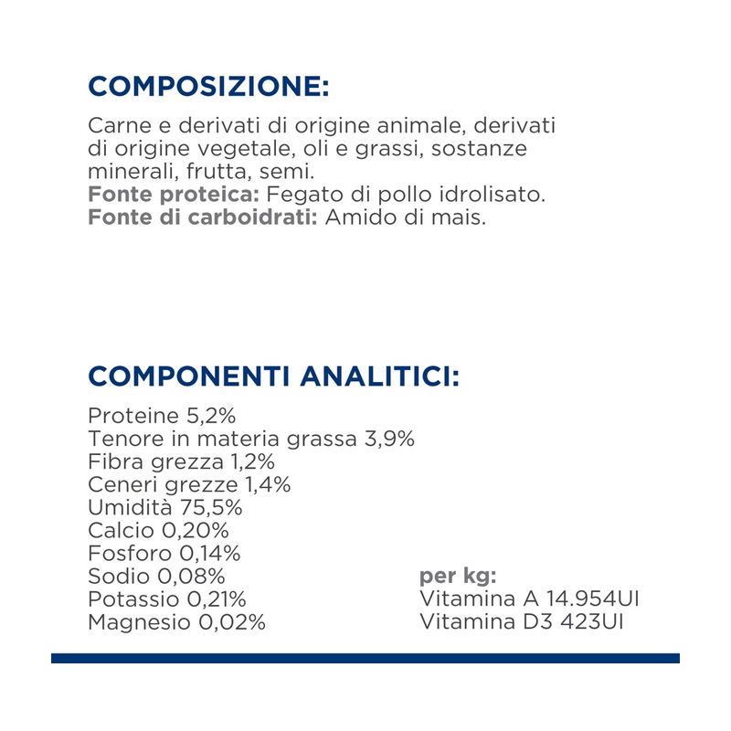 Hill's Prescription Diet z/d Food Sensitivities Alimento Umido per Cani è un alimento umido dietetico, formulato specificamente per cani adulti che soffrono di intolleranze alimentari o sensibilità a determinati nutrienti. Questo alimento umido è stato sviluppato dai nutrizionisti e veterinari Hill's con l'obiettivo di ridurre le reazioni avverse agli ingredienti e promuovere una salute ottimale. La formula si caratterizza per l'uso di ingredienti attentamente selezionati, tra cui una fonte proteica idrolisata, che riduce il rischio di reazioni allergiche, e una fonte di carboidrati specifica. Questa combinazione contribuisce a garantire una digestione ottimale e una nutrizione bilanciata, perfetta per i cani con sensibilità alimentari. Hill's Prescription Diet z/d contiene inoltre olio di pesce, ricco di acidi grassi essenziali come gli omega-3, e alti livelli di vitamina E, noti per i loro benefici sulla salute della pelle e del pelo. Questa formula aiuta a migliorare visibilmente l'aspetto della pelle, promuovendo una barriera cutanea sana e riducendo l'infiammazione. Un ulteriore vantaggio di questo alimento è la sua collaudata miscela di fibre prebiotiche, che supporta la salute intestinale e contribuisce a migliorare la qualità delle feci del cane. Inoltre, la formula S+OX SHIELD è progettata per favorire un ambiente urinario che riduce il rischio di formazione di cristalli di struvite e ossalato di calcio, proteggendo la salute del tratto urinario.