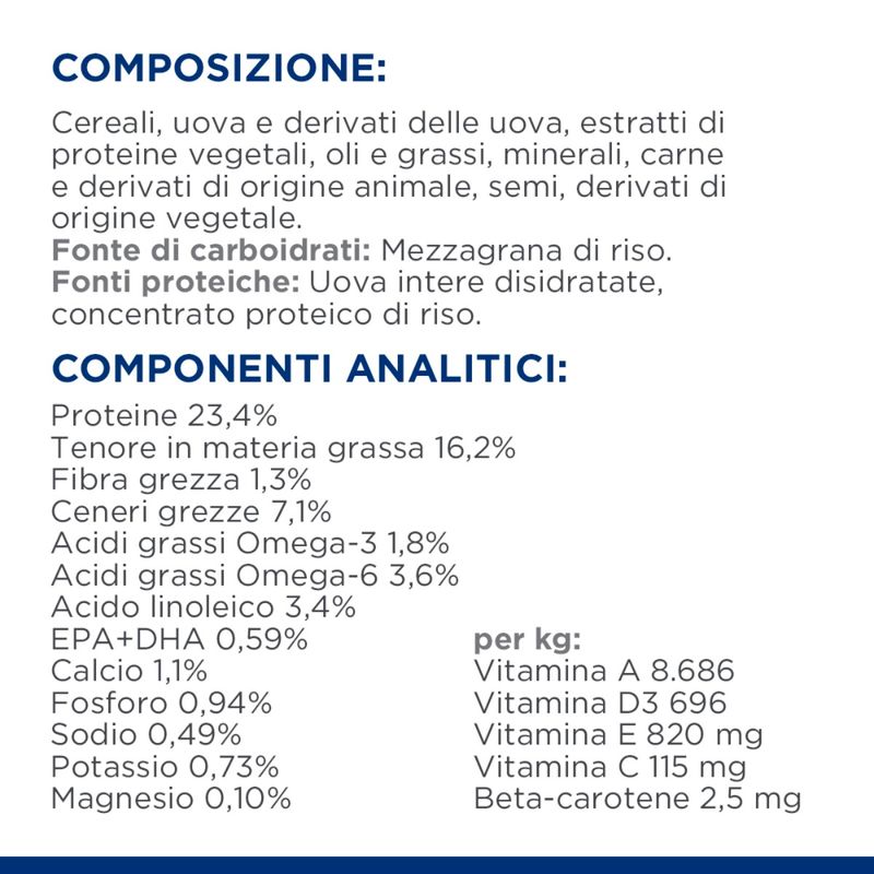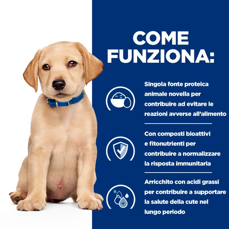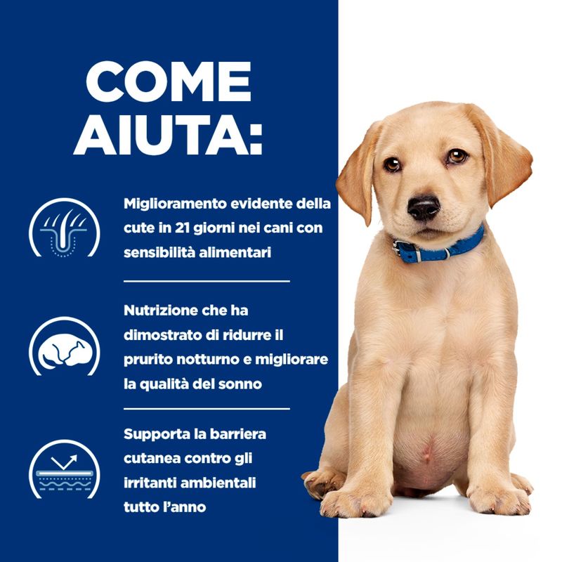 Hill's Prescription Diet Derm Complete alimento Puppy è un alimento secco dietetico, appositamente formulato dai nutrizionisti e veterinari Hill's per supportare la salute cutanea del tuo cane in caso di dermatosi ed eccessiva perdita di pelo. Questo alimento è particolarmente indicato per cuccioli che soffrono di intolleranze alimentari o sensibilità a determinati ingredienti e nutrienti. Questo alimento è ricco di acido linoleico (LA) e di acidi grassi omega-3, come l'acido eicosapentaenoico (EPA) e l'acido docosaesaenoico (DHA), essenziali per mantenere la pelle del cane sana e idratata, riducendo l'infiammazione e promuovendo un manto lucido e forte. La formula utilizza un numero limitato e selezionato di fonti di proteine e carboidrati, offrendo una nutrizione mirata con ingredienti limitati per minimizzare il rischio di reazioni avverse al cibo. Un elemento distintivo di questo alimento è l'impiego di una singola proteina novella animale intatta, studiata per ridurre le possibilità di allergie alimentari e garantire una digestione ottimale. Inoltre, Hill's Prescription Diet Derm Complete è arricchito con composti bioattivi e fitonutrienti, che contribuiscono a stimolare una risposta immunitaria sana, supportando il benessere generale del tuo cane, mentre gli omega-3 derivati dall'olio di pesce sono particolarmente benefici per la salute cutanea, aiutando a ridurre l'infiammazione e mantenendo la pelle elastica e resistente.