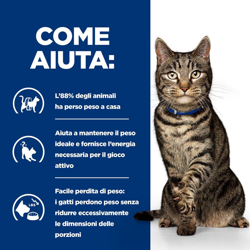 • Raccomandato per la gestione del peso nei gatti sovrappeso e il mantenimento del peso forma.