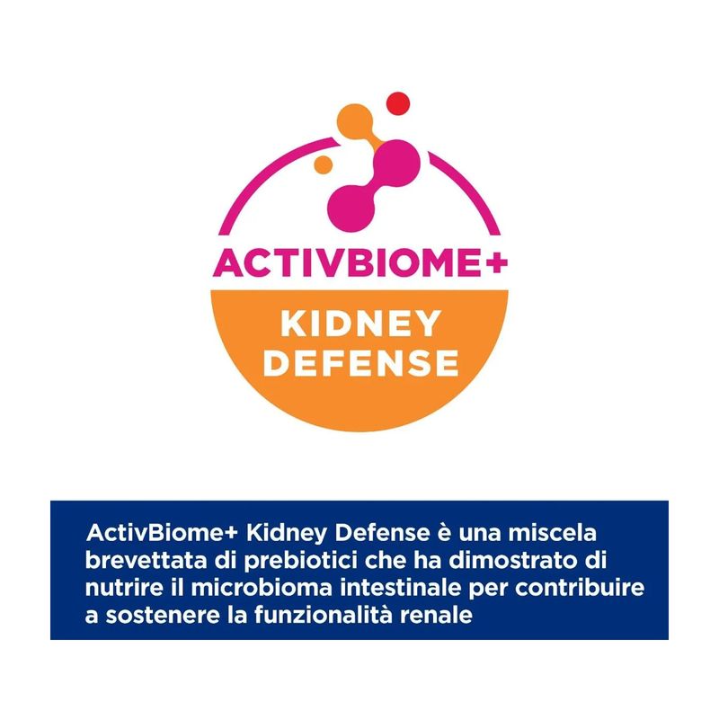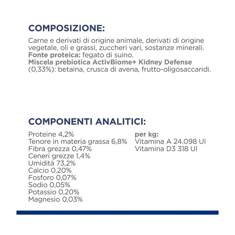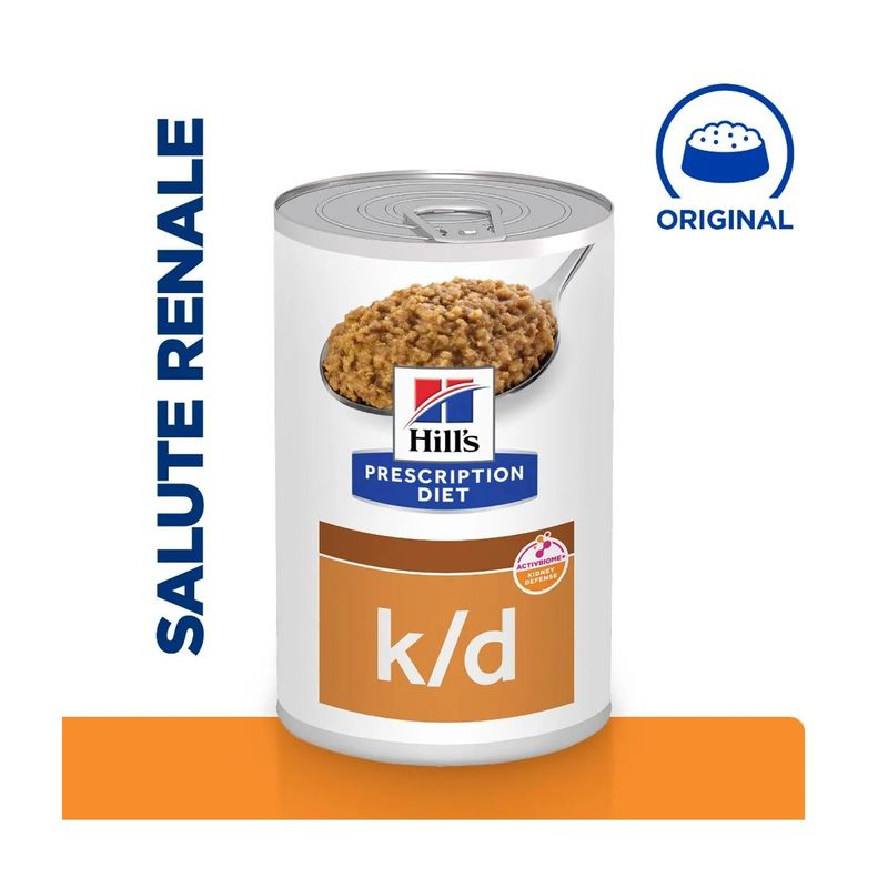 Hill's Prescription Diet k/d Kidney Care per Cani è un alimento umido dietetico completo, specificamente formulato per stimolare la funzione renale in casi di insufficienza renale acuta o cronica e per contribuire a ridurre l'occorrenza di episodi di uremia. Questo alimento è preparato con una speciale ricetta che contiene una bassa dose di fosforo e un tenore ristretto di proteine ma di elevata qualità. Inoltre, l'alto contenuto di antiossidanti aiuta a contribuire all'eliminazione dei radicali liberi. Questo cibo è arricchito con delizioso manzo, che lo rende non solo nutriente ma anche altamente appetibile. Hill's Prescription Diet k/d Kidney Care può essere facilmente somministrato in combinazione con un alimento secco di Hill's, permettendo al tuo cane di godere di una dieta gustosa e variata, che soddisfa le sue esigenze nutrizionali e supporta la sua salute renale. Realizzato con la tecnologia esclusiva di Hill's ActivBiome+, una speciale miscela di fibre prebiotiche, questo alimento è clinicamente testato per nutrire rapidamente il microbioma intestinale, supportando la qualità ottimale delle feci e la salute complessiva dell'apparato digerente. Grazie a questa tecnologia avanzata, l'alimento promuove un equilibrio ottimale della flora intestinale, garantendo una digestione efficiente e un assorbimento ottimale dei nutrienti.