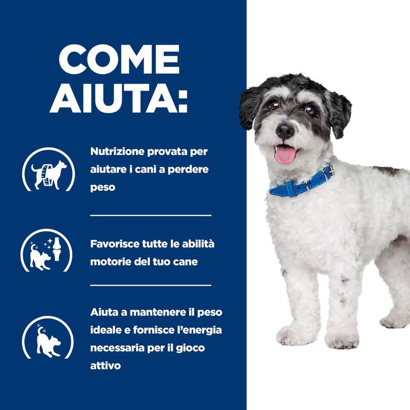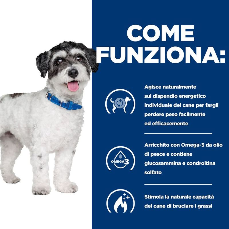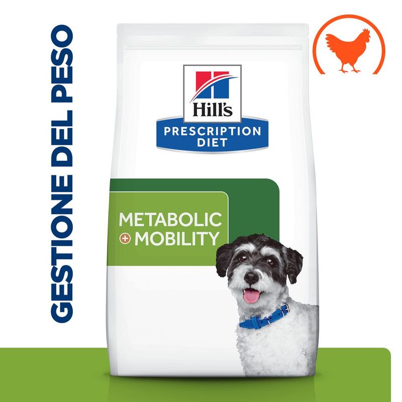 Hill's Prescription Diet Metabolic + Mobility Mini Alimento Secco per Cani è un alimento secco dietetico completo, specificamente formulato da nutrizionisti e veterinari Hill’s per la riduzione del peso corporeo in eccesso e per il supporto del metabolismo articolare in caso di osteoartrite nei cani adulti di piccola taglia. Funziona naturalmente con l'esclusivo consumo energetico del tuo cane per una perdita di peso facile ed efficace e può essere utilizzato a lungo termine. In effetti, Prescription Diet Metabolic + Mobility è un alimento clinicamente testato per aiutare i cani a perdere peso in modo naturale e migliorare la mobilità in appena 21 giorni. La formulazione di questo alimento contiene il pollo come fonte di proteina animale di alta qualità, garantendo un apporto proteico ottimale per sostenere la massa muscolare magra del tuo cane. È inoltre arricchito con omega-3 derivati dall'olio di pesce, glucosamina e condroitin solfato, che supportano la salute delle articolazioni e migliorano la mobilità. Questo alimento presenta una bassa densità energetica, il che permette al tuo cane di consumare una quantità adeguata di cibo senza assumere troppe calorie, facilitando una perdita di peso graduale e sicura. Contiene elevati livelli di EPA e di acidi grassi omega-3 totali, che hanno proprietà anti-infiammatorie e supportano la salute delle articolazioni. Il tenore adeguato di vitamina E contribuisce inoltre alla protezione delle cellule dai danni ossidativi. Con la tecnologia S+OXSHIELD, questo alimento promuove un ambiente urinario che riduce il rischio di sviluppare cristalli di struvite e ossalato di calcio, offrendo una protezione aggiuntiva per la salute urinaria del tuo cane.