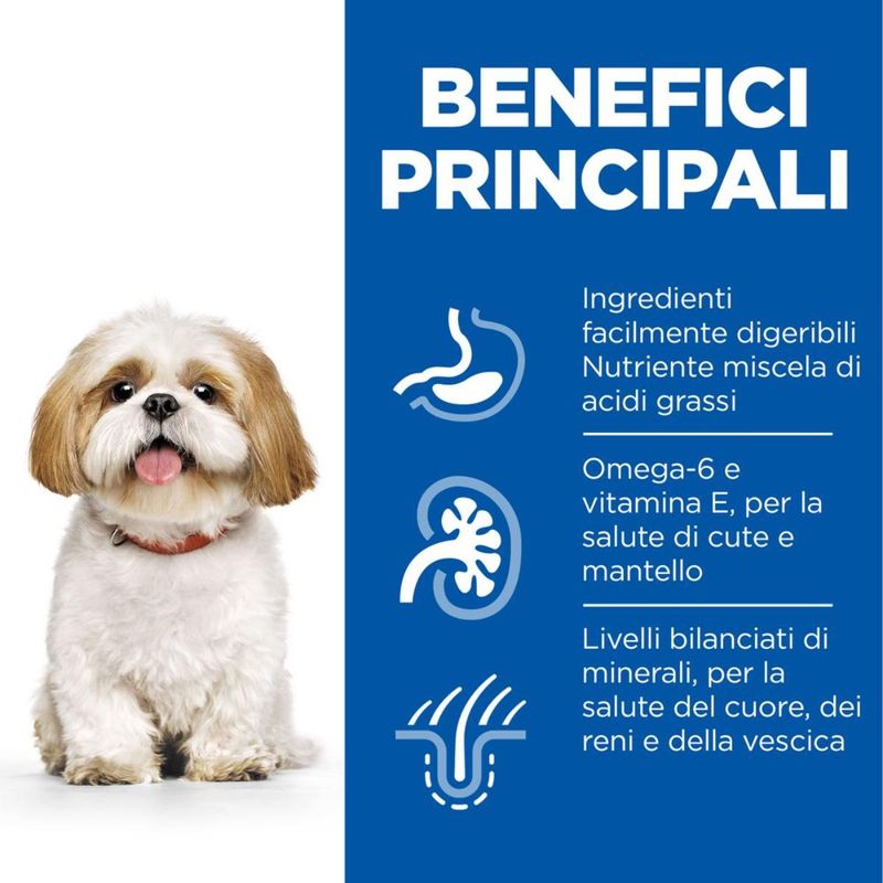 Il Hill's Science Plan Small & Mini Mature Adult 7+ Alimento Secco per Cani con Pollo è un alimento secco premium, specificamente formulato per le esigenze dei cani adulti maturi di taglia piccola e mini dai 7 anni in su. In questa fase della vita, i cani di piccola taglia hanno bisogno di un apporto nutrizionale bilanciato per invecchiare in modo sano e mantenere il loro benessere generale. Questa formula contiene minerali bilanciati che favoriscono la salute del cuore, dei reni e della vescica, organi particolarmente delicati con l’avanzare dell’età. Il saporito pollo è facilmente digeribile e rende il pasto appetitoso, mentre la tecnologia ActivBiome+ Multi-Benefit, a base di fibre prebiotiche e antiossidanti, supporta una digestione sana e un microbioma intestinale equilibrato. La presenza di omega-6 e vitamina E contribuisce alla salute della cute e alla bellezza del mantello, mentre le crocchette sono pensate in formato ridotto per adattarsi perfettamente alla bocca dei cani mini, rendendo ogni pasto più facile e gradevole. Il tutto in una formula completa e senza conservanti, coloranti né aromi artificiali, per offrire solo il meglio al tuo cane maturo.