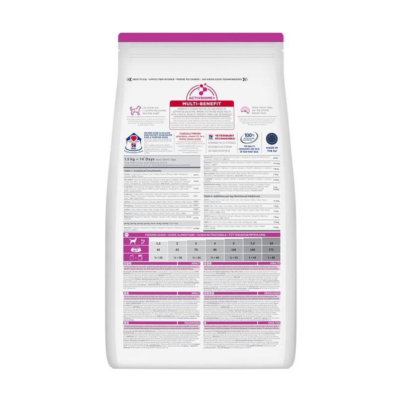 Il Hill's Science Plan Light Small & Mini Adult Alimento Secco per Cani con Pollo è un alimento secco premium studiato per rispondere alle esigenze nutrizionali dei cani adulti di taglia piccola e mini (1-6 anni), che necessitano di un controllo del peso. I cani di piccola taglia tendono più facilmente all’accumulo di peso e per questo è fondamentale offrire loro una dieta gustosa ma leggera. La ricetta, a base di pollo saporito, contiene un basso apporto calorico e L-carnitina, per contribuire al mantenimento del peso forma senza rinunciare al gusto. Inoltre, il controllo del senso di sazietà aiuta il cane a sentirsi appagato tra un pasto e l’altro, evitando gli eccessi. La presenza di omega-6 e vitamina E sostiene la salute della cute e la lucentezza del mantello, mentre la tecnologia ActivBiome+ Multi-Benefit, a base di fibre prebiotiche e antiossidanti, favorisce una digestione sana e un sistema immunitario più forte. Il tutto in una formula bilanciata, sicura e senza conservanti, coloranti o aromi artificiali.