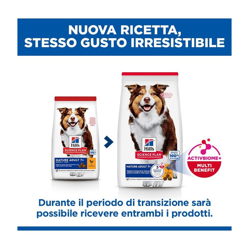Hill's Science Plan Cane Mature Adult 7+ Medium con Pollo si rinnova con nuovo pack e nuova formulazione. Potresti ricevere il nuovo o il vecchio pack in base alle disponibilità a magazzino.