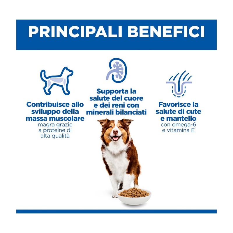 Hill's Science Plan Cane Mature Adult 7+ Medium con Pollo è un alimento secco completo, formulato per supportare la salute e il benessere dei cani adulti maturi di taglia media dai 7 anni in su. Con l’avanzare dell’età, i bisogni nutrizionali del tuo cane cambiano, e questa ricetta è studiata per aiutarlo a invecchiare in modo sano, mantenendo energia, vitalità e forza muscolare. Preparato con pollo saporito e altamente digeribile, offre un gusto irresistibile abbinato a un profilo nutrizionale bilanciato al 100%. La formula è arricchita con tecnologia ActivBiome+ Multi-Benefit, una miscela avanzata di fibre prebiotiche e antiossidanti, che favorisce la salute dell’apparato digerente e contribuisce a un microbioma intestinale equilibrato. Gli omega-6 e la vitamina E promuovono una cute sana e un mantello lucente, mentre le proteine di alta qualità aiutano a mantenere una muscolatura magra, anche nei cani più maturi. Inoltre, la presenza di minerali bilanciati contribuisce alla salute del cuore e dei reni, supportando le funzioni vitali del tuo compagno a quattro zampe. La combinazione di ingredienti è stata studiata per offrire un pasto facilmente digeribile che aiuti il cane a restare attivo e in forma, anche con il passare degli anni.