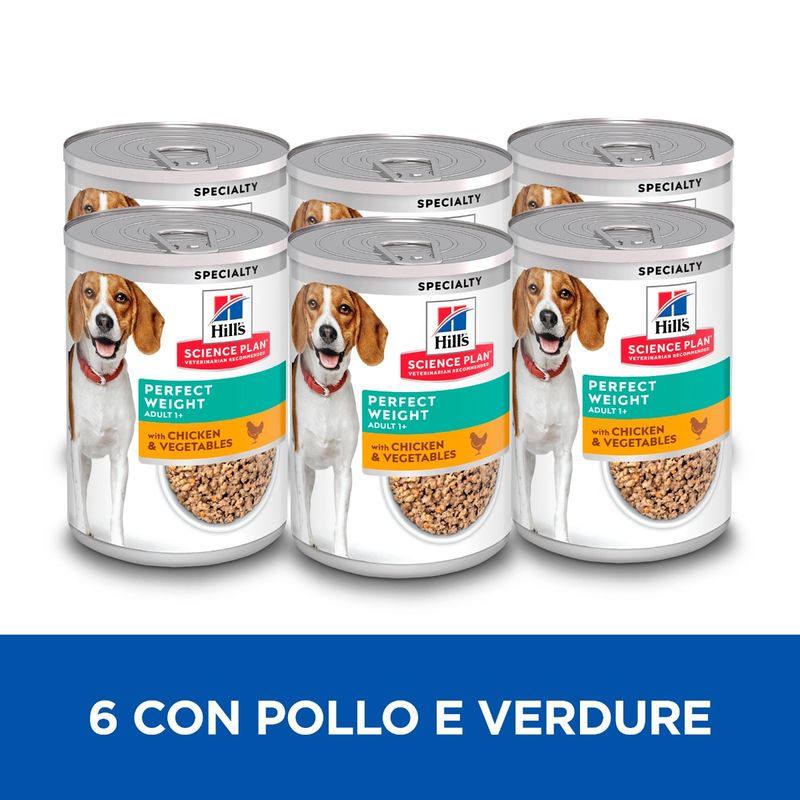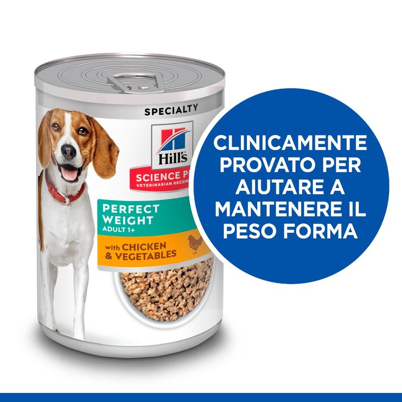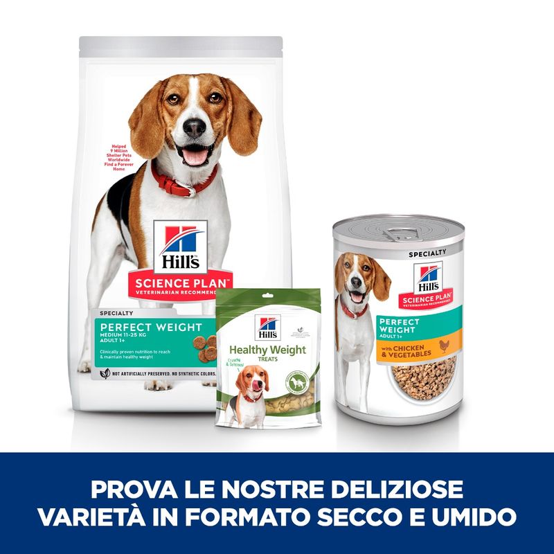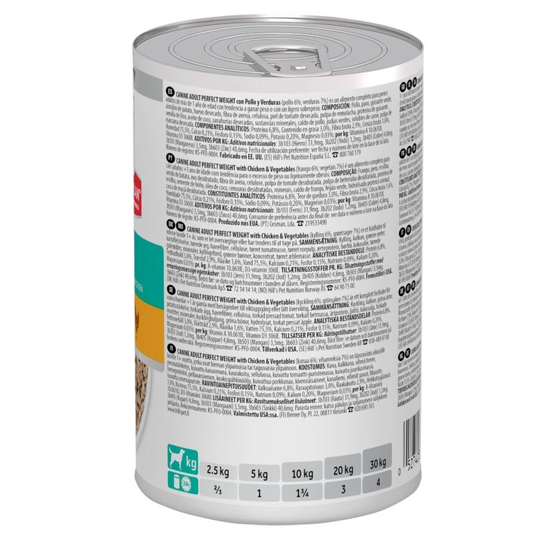 Offri al tuo peloso un profilo nutrizionale come quello di Hill's Science Plan Perfect Weight Dog Lattina 363G, specificamente studiato per favorire una salute sana per i cani adulti di piccola taglia tendenti al sovrappeso.