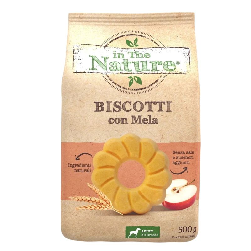 In The Nature Dog Biscotti Mela sono biscotti secchi ideali per uno spuntino veloce e gustoso, perfetti per cani adulti di tutte le razze. Seguono una ricetta semplice e naturale, senza conservanti, sale, olio di palma, lieviti e zuccheri aggiunti, per assicurare un prodotto di altissima qualità e facile digeribilità. Il delicato aroma di mela rende questi biscotti un premio appetitoso, perfetto per coccolare il tuo cane con un alimento sano e pregiato. Grazie alla loro formulazione semplice, sono ideali per chi cerca uno snack naturale e sicuro da offrire quotidianamente.