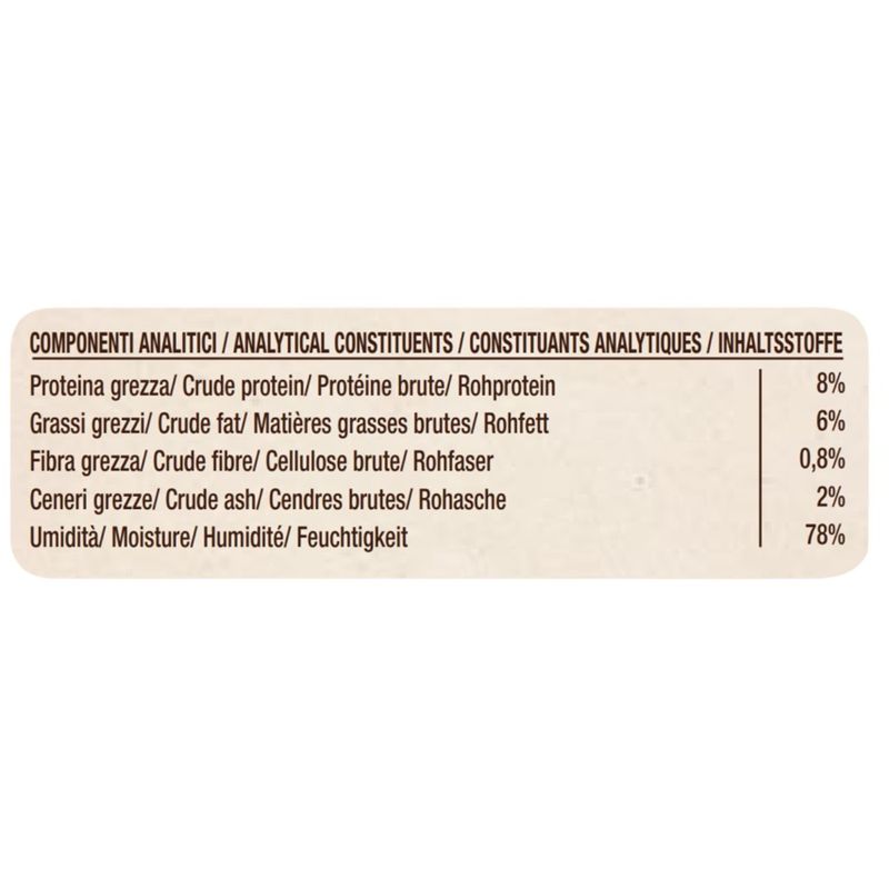 N.B. Il prodotto è disponibile in formato lattina da 400G ai gusti Manzo con Zucca e Mela, Vitello con Miglio Carote e Mela, Tacchino con Piselli Ceci e Mela, Salmone con Zucca e Olio di Salmone.