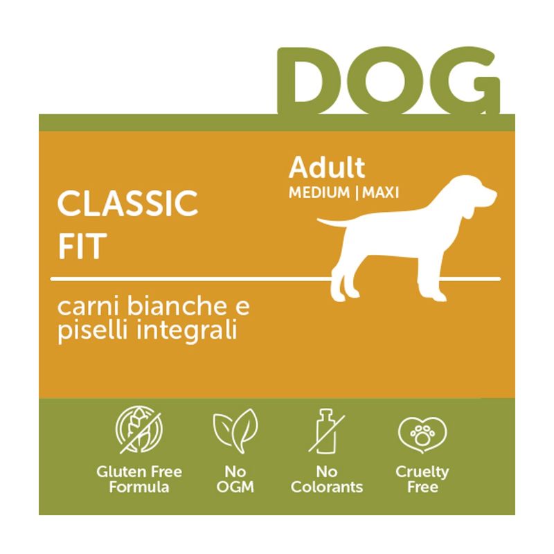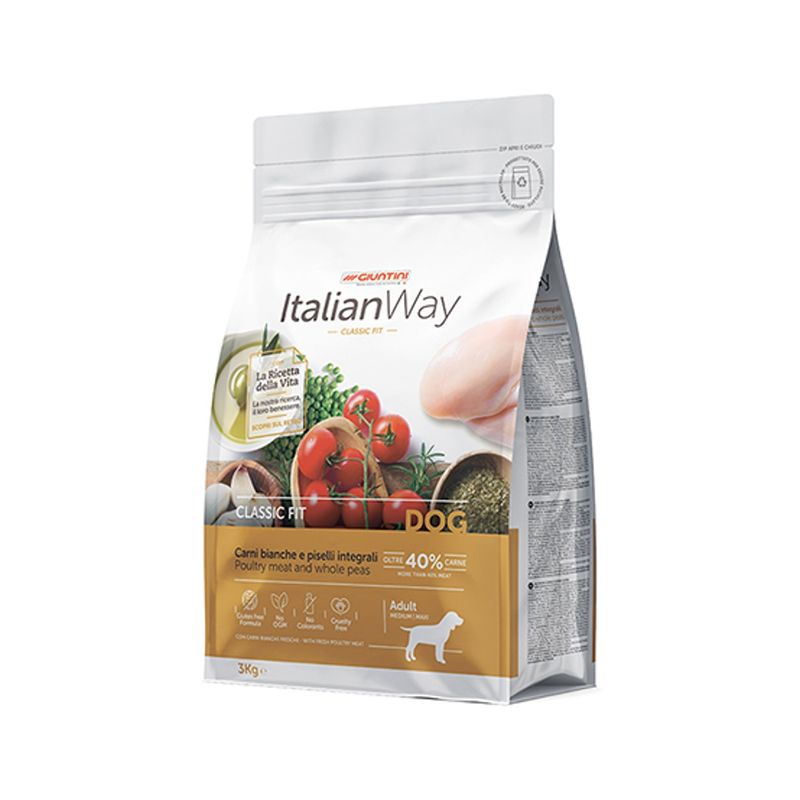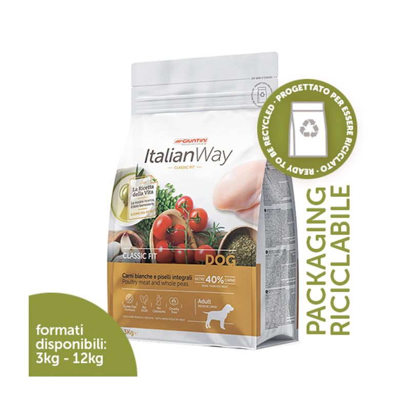 Regala al tuo piccolo compagno gusto e benessere ogni giorno con Italian Way Cane Medium/Maxi Classic Fit con Carni Bianche e Piselli Integrali – il pasto equilibrato che lo fa sentire al top!