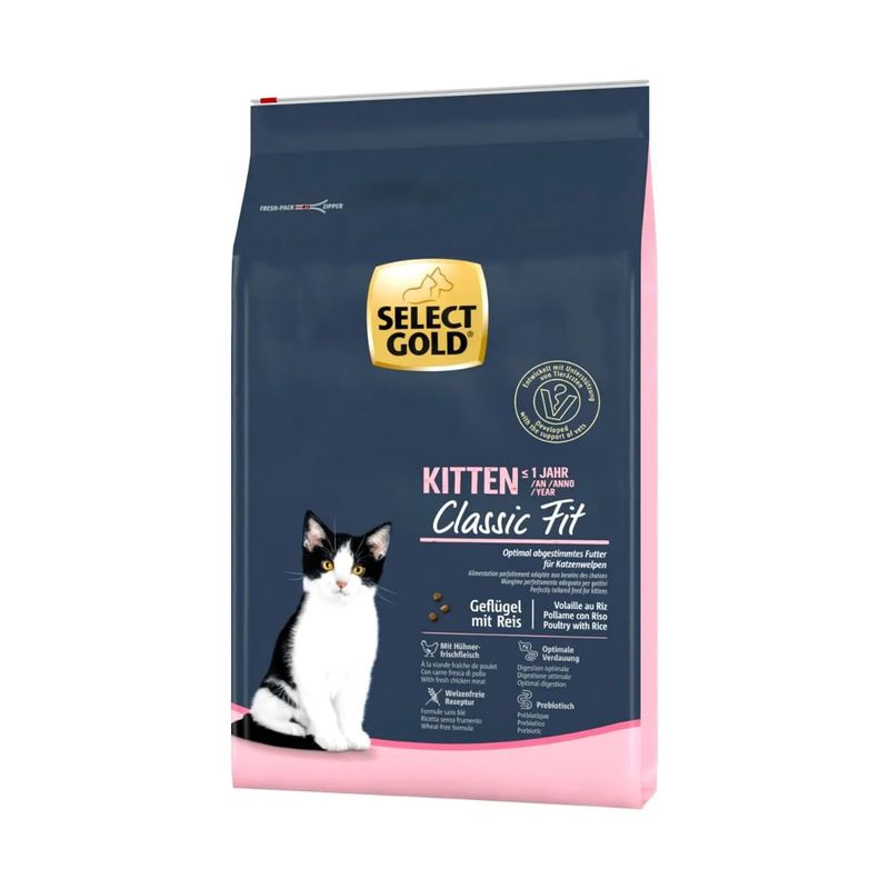 Il primo, Select Gold Kitten Classic Fit Pollame con Riso, è un alimento secco pensato per gattini dai 2 ai 12 mesi, studiato per favorire uno sviluppo sano e armonioso. Arricchito con calcio, fosforo e acidi grassi omega-3, supporta la crescita di ossa, denti e cervello. Contiene ingredienti funzionali come inulina prebiotica e DL-methionina per il benessere intestinale e delle vie urinarie, ed è ideale anche per cuccioli con sensibilità alimentari.