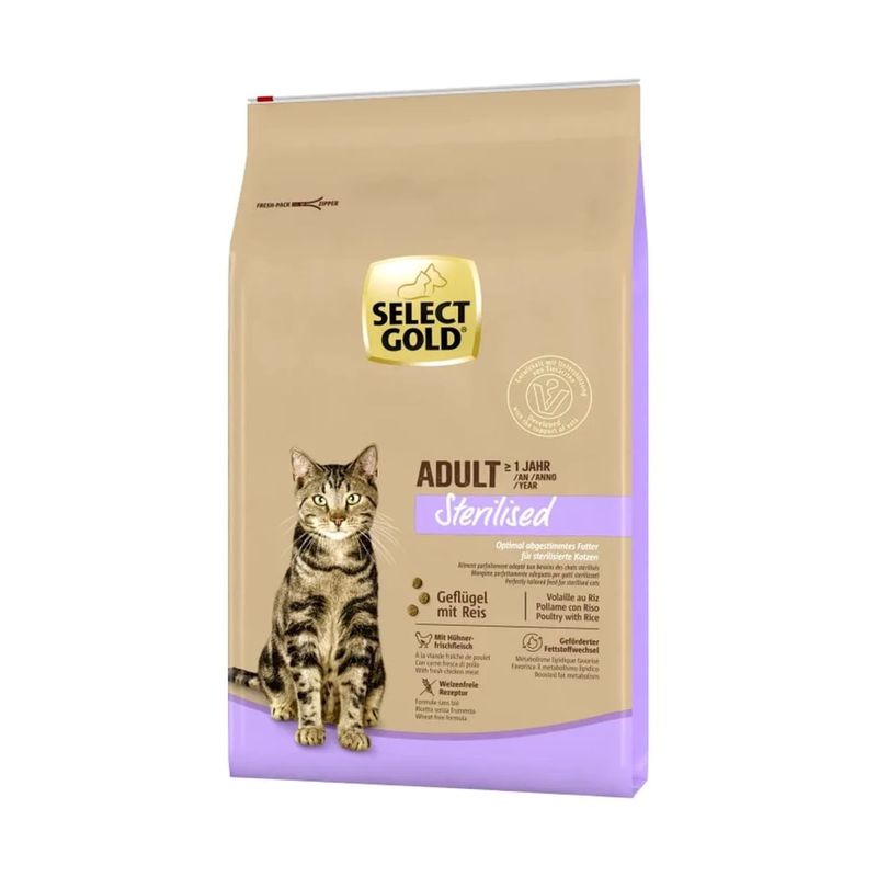 Il secondo, Select Gold Adult Sterilised Pollame con Riso, è un alimento completo per gatti adulti sterilizzati dai 12 mesi in su, formulato per aiutare il mantenimento del peso forma grazie alla sua ricetta bilanciata. È ricco di proteine di qualità, gustoso pollo fresco e riso, e privo di frumento. Offre benefici specifici come supporto al controllo del peso e salute del tratto urinario, mantenendo elevata l’appetibilità. Entrambi i prodotti sono senza coloranti, conservanti, aromi artificiali, zuccheri e soia, per una dieta pulita e naturale.