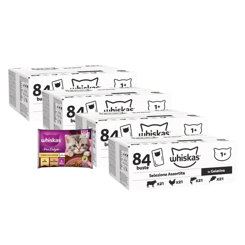 Scegli il Kit Multigusto Whiskas 336x85g + 4x85g Pure Delight Kitten incluso per offrire ai tuoi felini pasti completi, gustosi e bilanciati, garantendo qualità Whiskas e cura ottimale per gatti adulti e gattini!