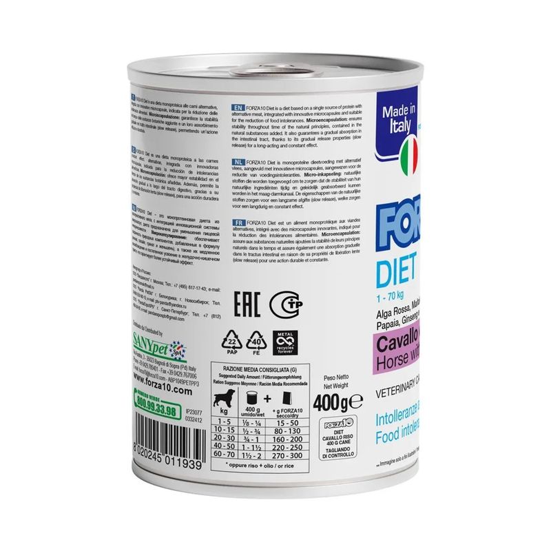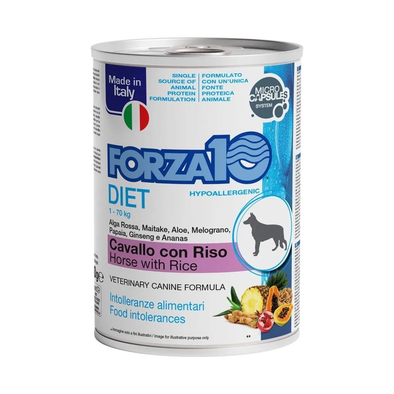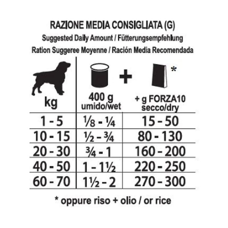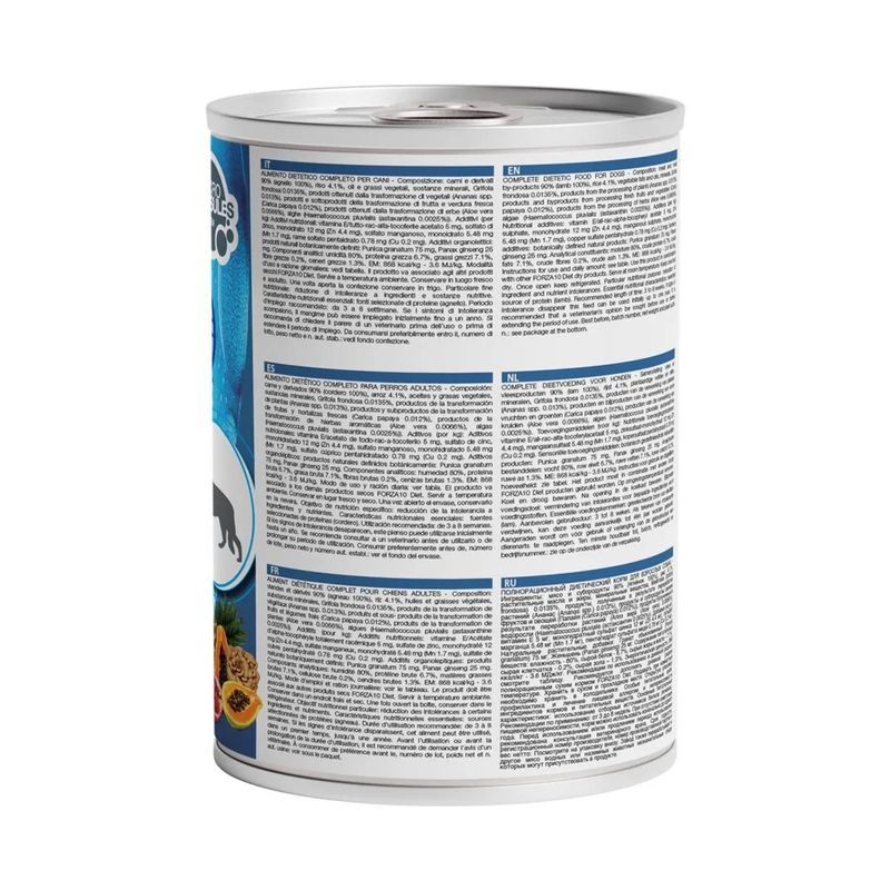 Kit Risparmio 12x400G Forza10 All Size Adult Diet Lattina è un alimento dietetico umido per cani adulti di tutte le taglie ed è il risultato di una ricerca approfondita condotta da esperti veterinari per cani adulti con intolleranze alimentari o sensibilità digestive. Il paté è considerato un'alimentazione completa e bilanciata, classificata come dieta veterinaria. Il paté è formulato con cura, utilizzando la carne come principale fonte proteica e riso come fonte di carboidrati, offrendo un apporto di carboidrati leggeri e facilmente digeribili, fornendo energia senza appesantire il sistema digestivo. L'equilibrio tra proteine e carboidrati è fondamentale per garantire una dieta facilmente digeribile e ben tollerata dagli stomaci sensibili dei cani. Inoltre, il paté è arricchito con oli e grassi vegetali per supportare la salute della pelle e del pelo, mentre ingredienti botanici come il Grifola frondosa, l'ananas e la papaya favoriscono la digestione grazie alle loro proprietà naturali e agli enzimi che aiutano a migliorare l'assimilazione dei nutrienti. L'aloe vera, nota per le sue proprietà lenitive, supporta il benessere digestivo e la salute generale del cane. Infine è arricchito con vitamine e minerali essenziali come la vitamina E, zinco, rame, iodio e manganese, questo alimento contribuisce a mantenere una salute ottimale delle ossa, del sistema immunitario e della pelle. Gli estratti naturali di melograno e ginseng aggiungono ulteriori benefici antiossidanti e tonici, promuovendo vitalità ed energia.