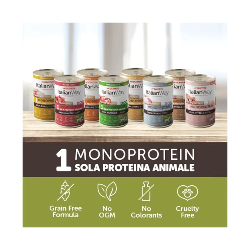 Scegli la delicatezza che fa la differenza con Kit Risparmio 12x400G Italian Way Cane Monoprotein Hypoallergenic Lattina – il pasto sicuro, naturale e super appetitoso per i cani più sensibili!