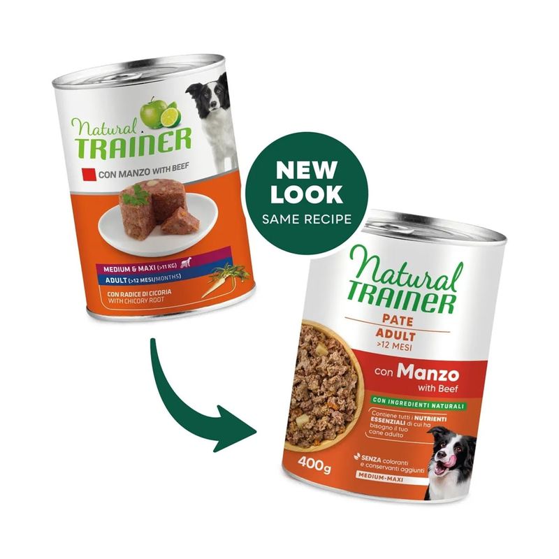 Attenzione: Kit Risparmio 12x400G Natural Trainer Dog Medium Maxi si rinnova con nuovo packaging e nuova formulazione. Potresti ricevere il nuovo o il vecchio pack a seconda della disponibilità a magazzino.