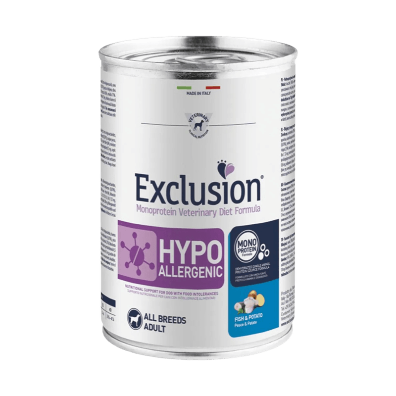Kit Risparmio 24x400G Exclusion Dog Diet Hypoallergenic è un alimento umido dietetico in lattina, per cani adulti, specificamente formulato per la riduzione delle intolleranze a ingredienti e sostanze nutritive. La formulazione monoproteica di questo alimento è realizzata con un’unica fonte alternativa di proteine animali derivanti dalla carne o dal pesce. Questo approccio aiuta a ridurre il rischio di intolleranze alimentari e allergie, assicurando che il tuo cane riceva proteine di alta qualità in modo sicuro. Gli ingredienti innovativi utilizzati nella preparazione di questo alimento sono attentamente selezionati per garantire la massima qualità e il benessere del tuo cane. L’alimento è preservato con tocoferoli naturali, che aiutano a mantenere la freschezza e la qualità del cibo senza l’uso di conservanti artificiali. Inoltre, contiene patate o piselli come principale fonte di carboidrati, garantendo una facile digestione e un apporto energetico costante. Le patate e i piselli non solo offrono una buona fonte di energia, ma sono anche meno probabili di causare reazioni allergiche rispetto ad altri cereali comuni.