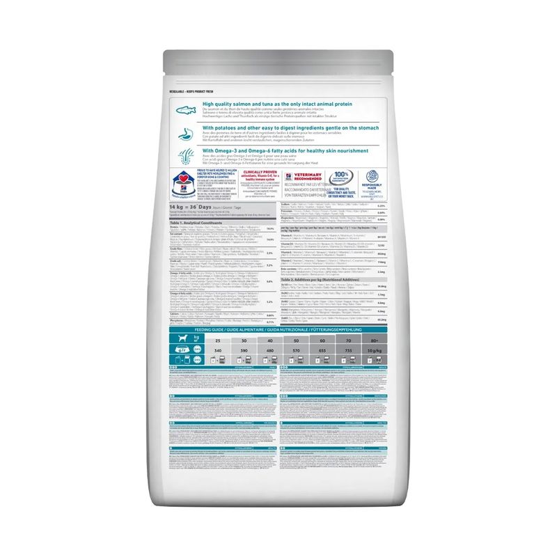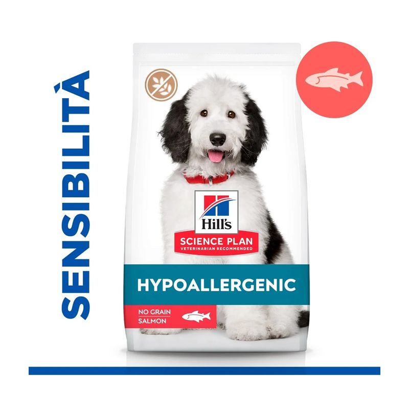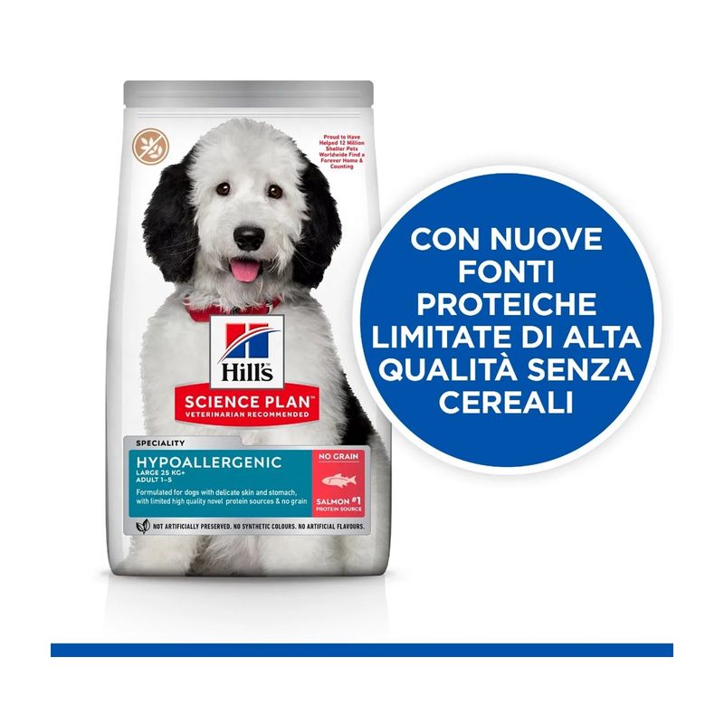 Kit Risparmio 2x14KG Hill's Science Plan Hypoallergenic Large Adult Dog è un cibo secco formulato per soddisfare i fabbisogni nutrizionali ed energetici del cane adulto di taglia grande, a partire dai 25kg di peso, al gusto salmone, è appositamente formulato per quei cani soggetti a disturbi intestinali infatti risulta una formulazione delicata per lo stomaco perché contiene ingrediente altamente digeribili e si prende anche cura del manto grazie agli Omega-3 e gli Omega-6.