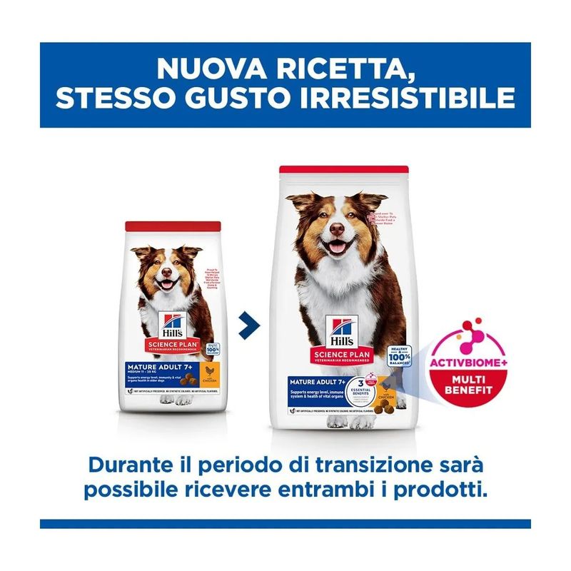 Kit Risparmio 2x14KG Hill's Science Plan Medium Mature Adult 7+ Dog Pollo si rinnova con nuovo pack e nuova formulazione, arricchita con l’innovativa tecnologia ActivBiome+, una miscela esclusiva di fibre prebiotiche e antiossidanti che supporta una digestione sana e promuove il benessere generale dell’organismo. Potresti ricevere il nuovo o il vecchio pack in base alle disponibilità a magazzino.