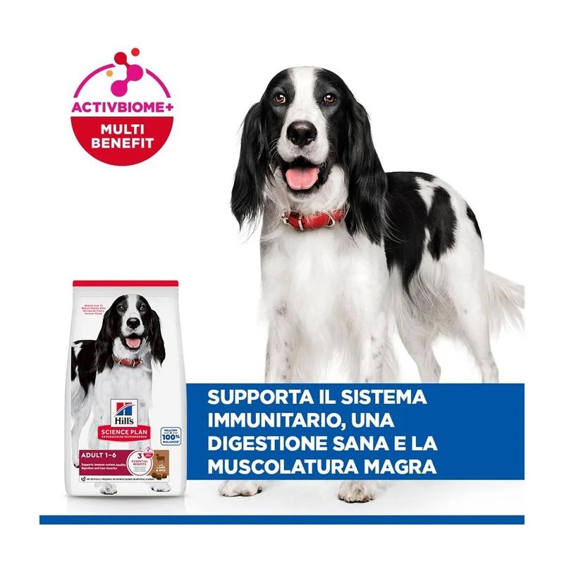 Kit Risparmio 2x18KG Hill's Science Plan Medium Adult Dog è un alimento secco completo, appositamente formulato per rispondere alle esigenze nutrizionali dei cani adulti di taglia media (1-6 anni) nel pieno della loro vitalità. La sua ricetta bilanciata fornisce tutta l’energia necessaria per sostenere uno stile di vita attivo, mantenendo il cane in salute giorno dopo giorno. Preparato con delizioso agnello e riso di alta qualità, è particolarmente indicato per favorire una digestione sana e delicata, grazie anche alla presenza della tecnologia ActivBiome+ Multi-Benefit. Questa esclusiva miscela di fibre prebiotiche e antiossidanti sostiene la flora intestinale e rafforza il sistema immunitario, migliorando il benessere generale dell’animale. Le proteine di alta qualità aiutano a mantenere una muscolatura magra e forte, fondamentale per la salute e la mobilità nei cani di taglia media. Inoltre, l'aggiunta di omega-6 e vitamina E favorisce una cute sana e un mantello brillante, visibilmente più morbido e lucente. Ogni crocchetta è pensata per offrire gusto e nutrizione in ogni pasto, contribuendo a una dieta equilibrata e supportata dalla scienza per garantire al tuo cane una vita lunga e in piena forma.