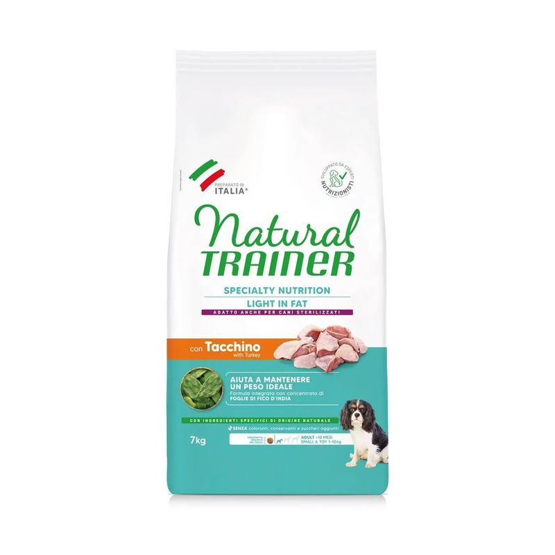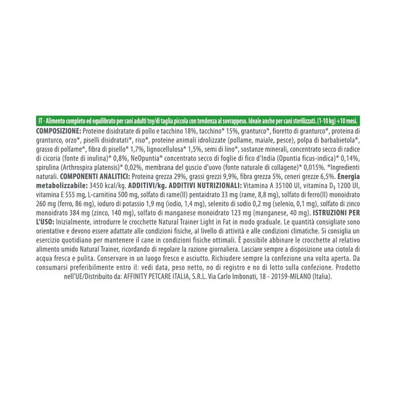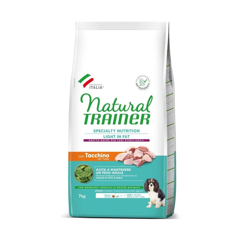 Il Kit Risparmio 2x7KG Natural Trainer Dog Adult Mini Light in Fat Tacchino è un alimento completo ed equilibrato secco, studiato appositamente per cani adulti di taglia piccola e toys tendenti al sovrappeso. La formulazione ha il 40% di grassi in meno, grazie alla L-carnitina e con un basso contenuto calorico. Le crocchette contengono le fibre vegetali, minerali e concentrato di foglie di fico d'India per aiutare a ridurre l'assorbimento dei grassi. Tra le fibre vegetali troviamo la lignocellulosa, la crusca di frumento e la fibra di pisello. La Yucca schidigera insieme ai prebiotici aiutano a ridurre il cattivo odore delle feci. Mentre l'alga spirulina, le proteine, i minerali e le vitamine aiutano a supportare la vitalità del cane. Una combinazione di minerali aiuta a ridurre la formazione di tartaro e per finire, con frutta che contiene antiossidanti di origine naturale.