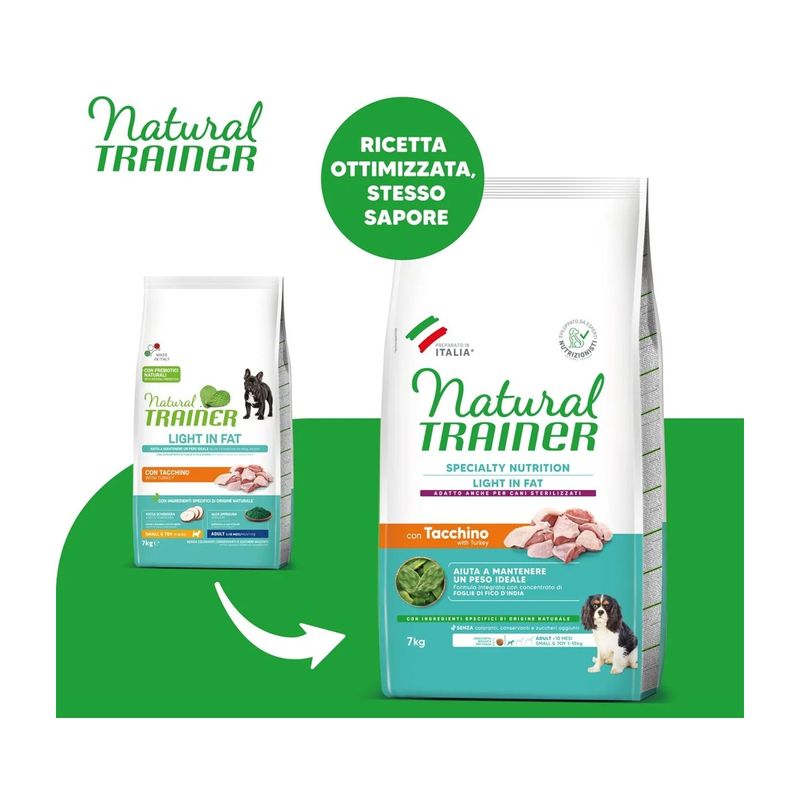 Natural Trainer Dog Adult Mini Light in Fat Tacchino si rinnova con nuovo pack e nuova formulazione. Potresti ricevere il nuovo o il vecchio pack in base alle disponibilità in magazzino.