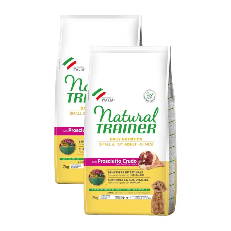 Il Kit Risparmio 2x7KG Natural Trainer Dog Small Toy è un’alimento secco formulato con proteine di alta qualità e ingredienti naturali attentamente selezionati per garantire un apporto nutrizionale ottimale per il tuo cane di taglia toy. La presenza di Yucca schidigera e prebiotici favorisce la salute intestinale del tuo cane, aiutando anche a ridurre il cattivo odore delle feci. L'alga spirulina, insieme alle proteine, ai minerali e alle vitamine incluse nella formulazione, contribuisce a sostenere la vitalità generale del tuo cane, assicurandosi che mantenga alti livelli di energia e benessere. Una combinazione di minerali specifici è stata aggiunta per contribuire a ridurre la formazione di tartaro sui denti del tuo cane, promuovendo così una migliore igiene orale e la salute dentale. Contribuisci a mantenere la salute del tuo fido e a creare esperienze fantastiche insieme. Grazie alla combinazione di ingredienti, il tuo pet potrà avere un pasto salutare e allo stesso tempo sazioso, grazie al gusto unico di manzo, pollo fresco o prosciutto crudo come unica fonte proteica animale. Questo mangime ti assicura che il tuo amico a quattro zampe non dovrà mai rinunciare al gusto, in quanto il prodotto è appositamente formulato per essere appetibile e per soddisfare il palato del tuo peloso. L'aggiunta di frutta fornisce antiossidanti naturali che aiutano a proteggere il tuo cane dai danni causati dai radicali liberi e a sostenere la sua salute generale nel lungo termine.