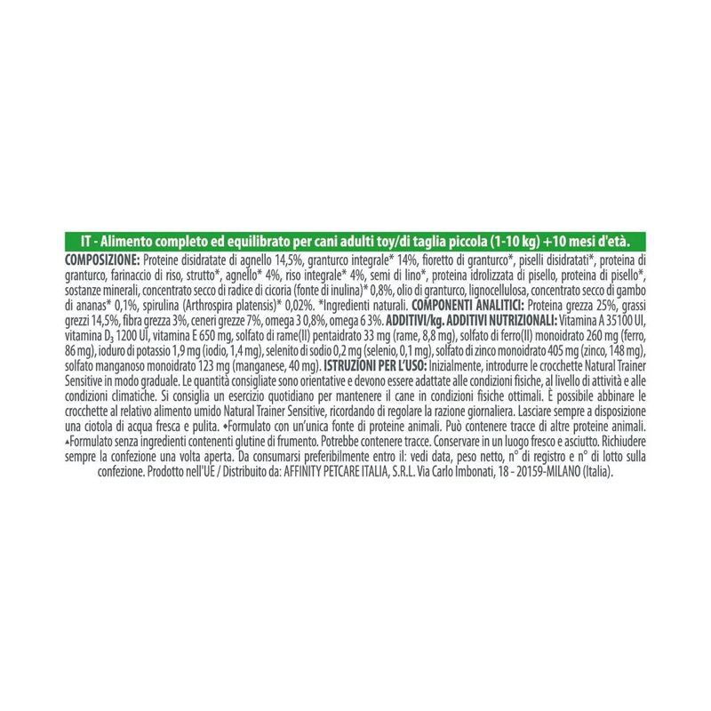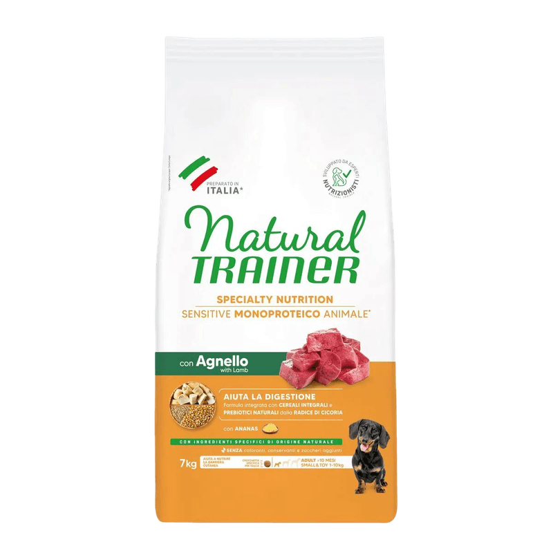 Scopri il Kit Risparmio 2x7KG Natural Trainer Sensitive Dog No Gluten Adult Mini, l'alimento completo e bilanciato pensato per cani adulti di taglia piccola e toys con sensibilità intestinale. Approfitta di questa offerta conveniente per garantire al tuo cane una dieta sana e facilmente digeribile, senza glutine e ricca di ingredienti sani che favoriscono la sua salute e il benessere.