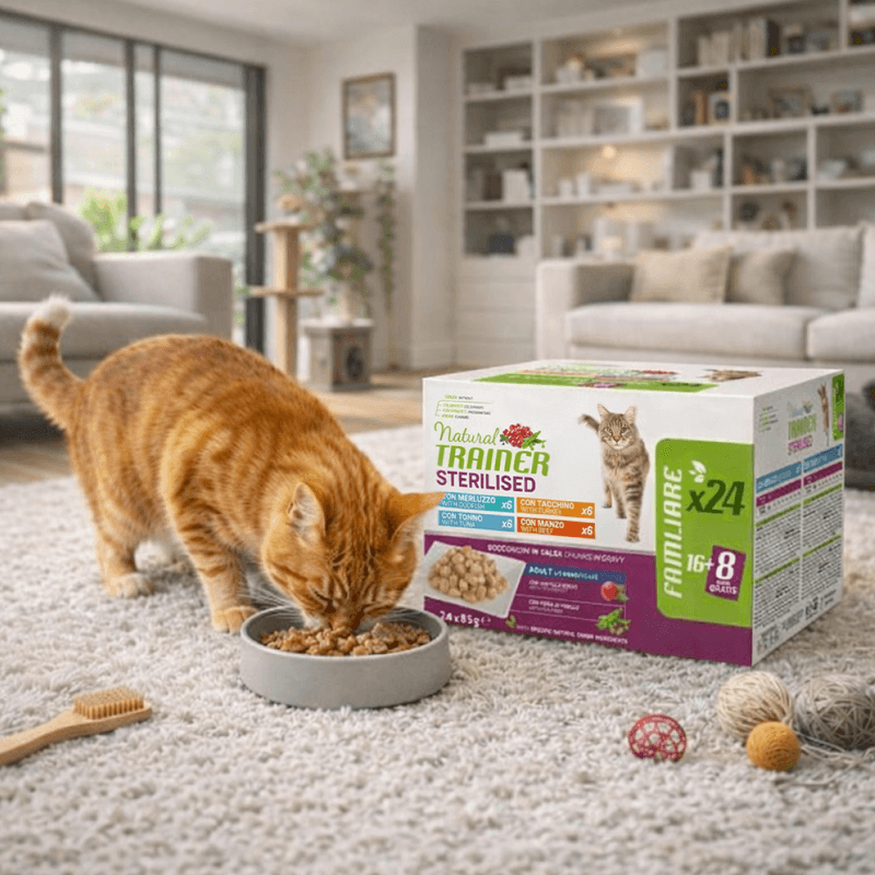 Natural Trainer Kit Risparmio 48x85G Natural Trainer Cat Sterilised, per offrire al tuo felino sterilizzato una dieta equilibrata e deliziosa. Ogni bocconcino è una dimostrazione di amore e cura, garantendo al tuo micio una crescita felice e in salute, risparmiando!