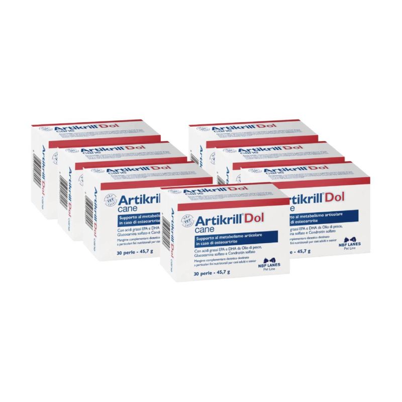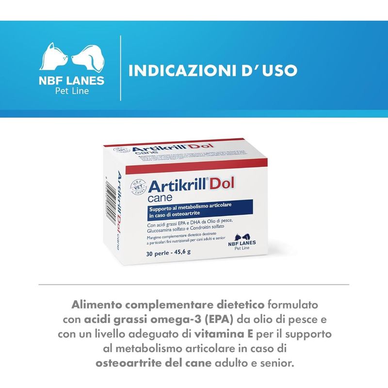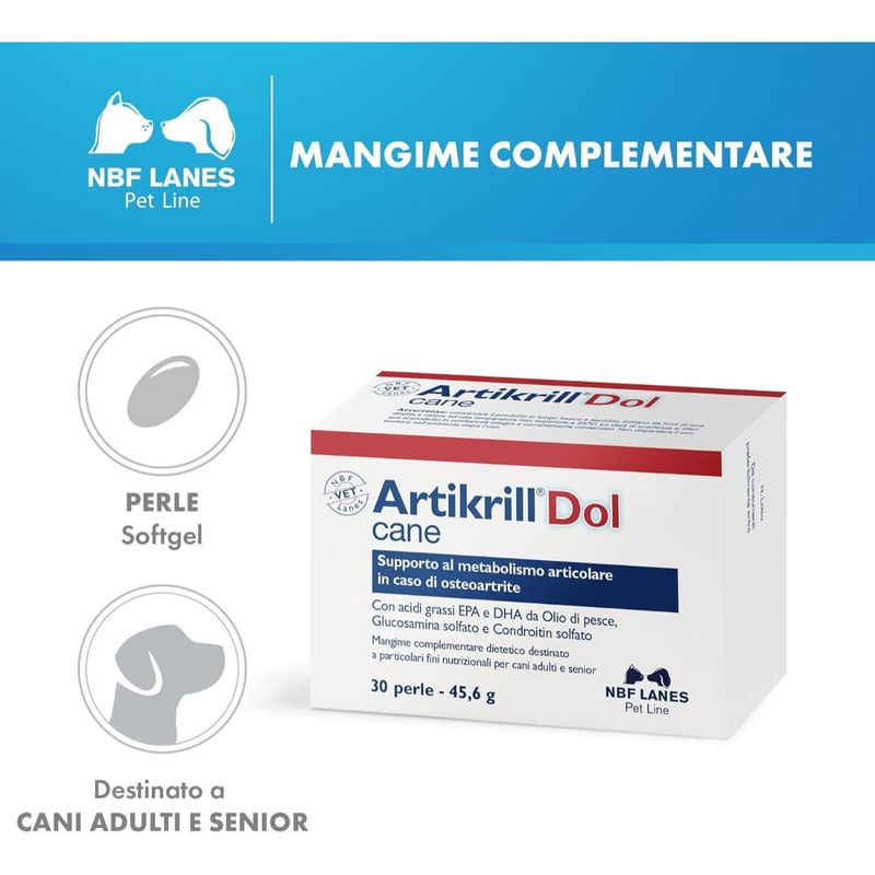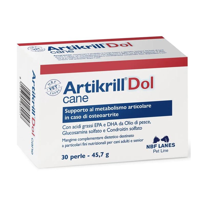 Il Kit Risparmio 7x30CP Artikrill Dol Mangime Complementare Dietetico per Cani è un mangime complementare dietetico formulato specificamente per il supporto del metabolismo articolare nei cani affetti da osteoartrite. Questo prodotto innovativo e completo è studiato per contrastare le principali problematiche delle fasi iniziali dell'osteoartrite: dolore, infiammazione e stress ossidativo. Artikrill Dol è particolarmente indicato per ridurre l'infiammazione e il dolore articolare, condizioni comuni nei cani affetti da osteoartrite, sia primaria che secondaria. Può essere utilizzato in combinazione con protocolli farmacologici per il controllo della patologia, offrendo un sostegno nutrizionale privo di effetti collaterali. Nel lungo periodo, Artikrill Dol può contribuire a ridurre il dosaggio dei farmaci necessari per il trattamento dell'osteoartrite, migliorando la qualità della vita del cane. Il prodotto è inoltre consigliato per il trattamento delle forme di iperalgesia articolare, dove il dolore è percepito a seguito di movimenti contro la resistenza del tessuto, e per i casi di articolazioni danneggiate o infiammate, in cui il dolore si manifesta anche durante movimenti normali.