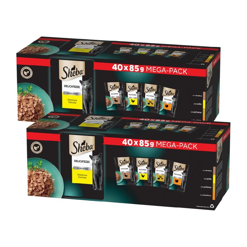 Kit Risparmio 80x85G Sheba Delicatezze è un alimento umido pensato per gatti adulti, perfetto per chi desidera alternare sapori delicati con una consistenza invitante. Disponibile in due varianti irresistibili – Selezione Delicata e Selezione del Mare – questo kit risparmio contiene 80 buste da 85g, ognuna con teneri bocconcini in gelatina, ideali per soddisfare anche i gatti più esigenti. La Selezione Delicata propone una gustosa rotazione di anatra, pollo, pollame e tacchino, per chi ama i sapori classici della carne. La Selezione del Mare, invece, è dedicata ai mici che prediligono il pesce, con ricette a base di salmone, pesce bianco, tonno e merluzzo. Ogni pasto è completo e bilanciato, studiato per supportare una digestione ottimale, una pelle sana e un pelo lucido. Inoltre, queste ricette sono realizzate senza coloranti, senza conservanti artificiali e completamente senza cereali, per offrire una nutrizione naturale e adatta anche ai gatti più sensibili.