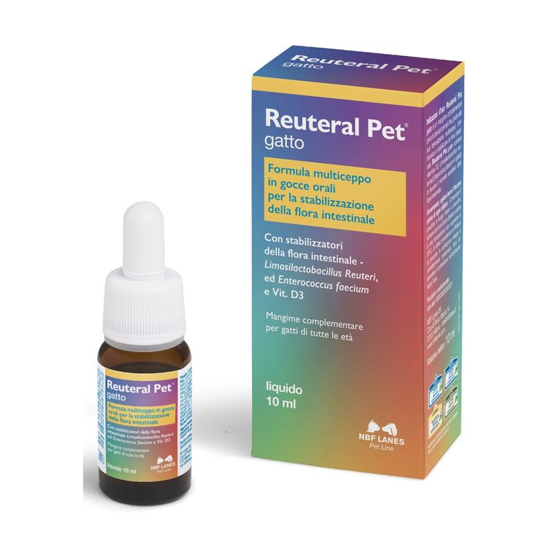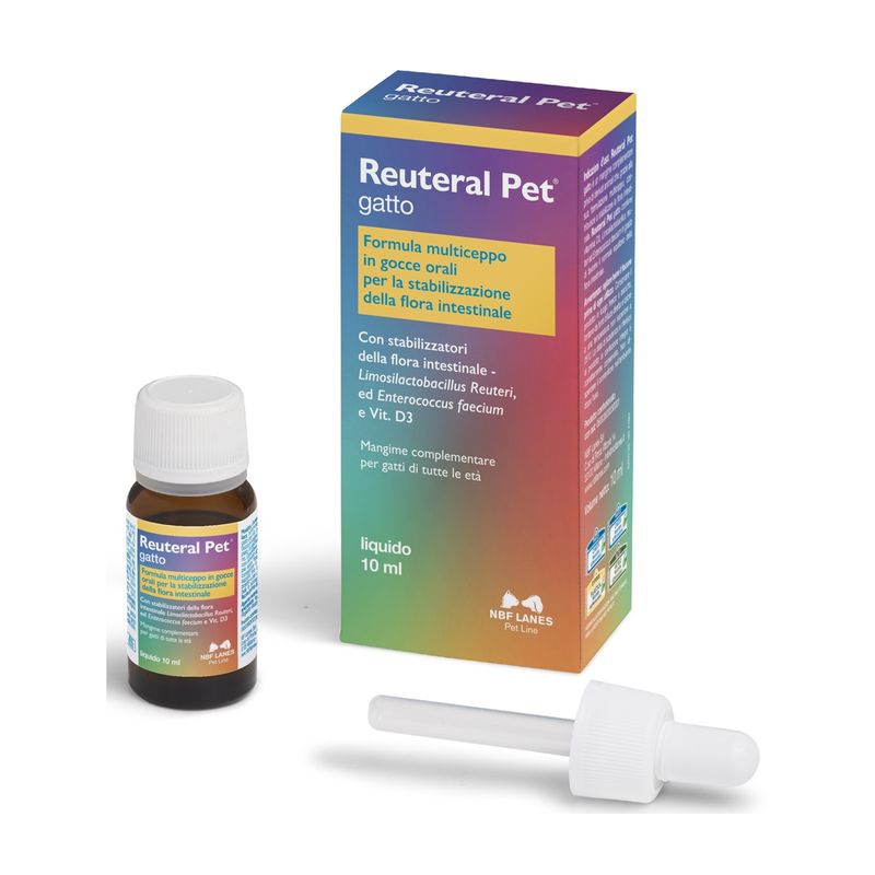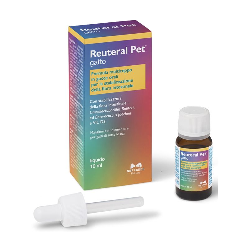 Reuteral Pet Gatto Gocce è un alimento complementare per gatti. È un mangime complementare privo di derivati animali che, grazie alla sua formulazione multiceppo, contribuisce a stabilizzare la flora intestinale. Formula multiceppo in gocce orali per la stabilizzazione della flora intestinale. Mangime complementare per gatti di tutte le età con stabilizzatori della flora intestinale. Contiene Limosilactobacillus Reuteri, ed Enterococcus faecium e Vitamina D3. La vitamina D3 è molto importante per mantenere in salute denti, ossa e articolazioni. contribuire al buon funzionamento dei muscoli e del sistema nervoso.