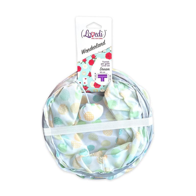 Lovedì Gioco Tunnel Wonderland Dream per Gatti è un tunnel a tre vie che offre un’esperienza di gioco e relax senza pari per i tuoi gatti. Ideale per gatti di tutte le età e taglie, questo tunnel è realizzato con tessuti leggeri ma resistenti, decorati con un motivo a pois color pastello che si integra perfettamente in ogni ambiente domestico. Il tunnel favorisce il movimento e la curiosità naturale dei gatti, stimolando il gioco attivo e il senso di esplorazione, oltre a offrire un rifugio sicuro dove nascondersi e rilassarsi. Grazie alla sua struttura a tre vie, permette al gatto di entrare, uscire e attraversare liberamente, aumentando il divertimento e l’interazione. Al centro del tunnel c’è un simpatico pallino sospeso che stimola il gioco e mantiene viva l’attenzione del tuo micio. Il tunnel è facilmente pieghevole e salvaspazio, pratico da aprire e chiudere, ideale anche per portarlo con sé in viaggio o per cambiare rapidamente la disposizione della casa.